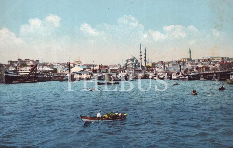 Denizden Eminönü, Galata köprüsü ve gemiler görünümü, lake baskı