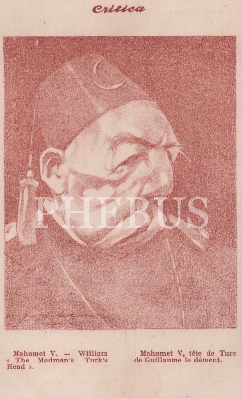 Sultan 5. Mehmed Reşad karikatür çizim kartpostal, arkası 1916 Fransızca yazışmalı