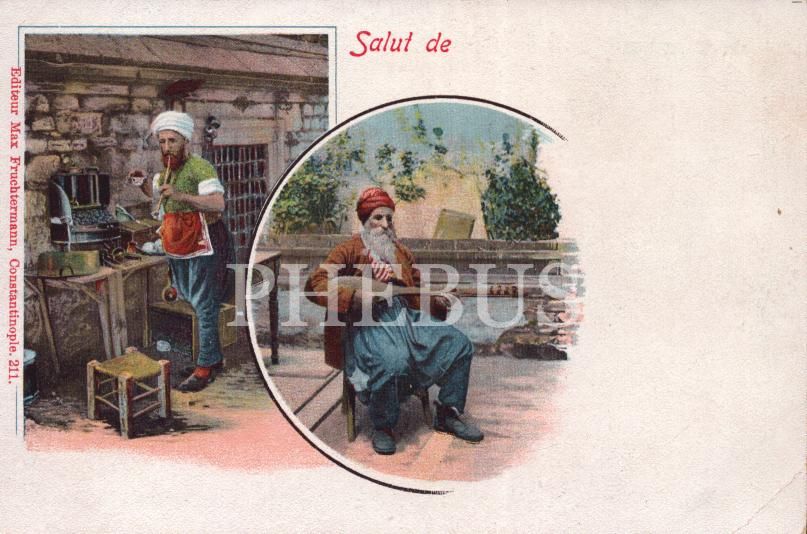 Kahveci ve çalgıcı taşbaskı meslek kartpostalı, Constantinople, ed. ed. Max Fruchtermann
