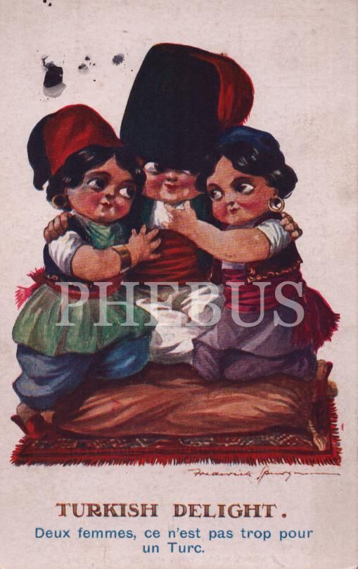 Kartpostal üzerinde Fransızca "Bir Türk için iki kadın çok değil" yazılıdır.