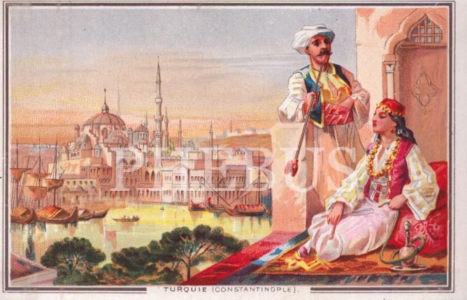İstanbul manzaralı nargile keyfi yapan hanımefendi ve beyfendi görselli taşbaskı ticaret kartı, 7x12 cm