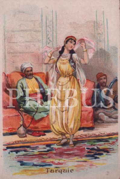 Dansöz kadın, çalgıcı ve nargile içen adam görselli taşbaskı ticaret kartı, Belle Jardiniere, 7x12 cm