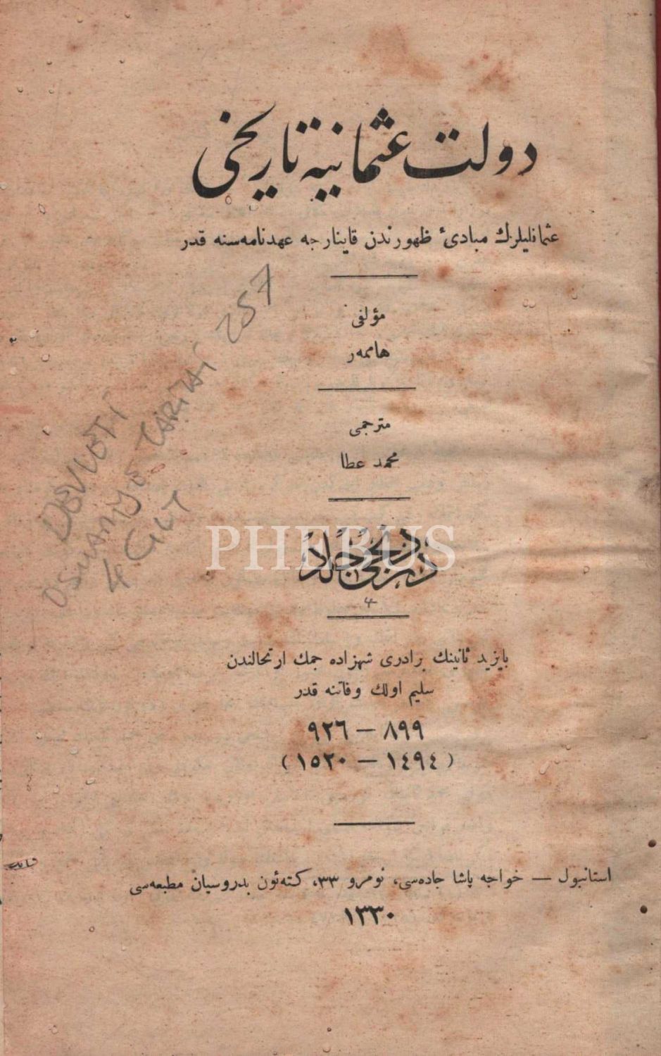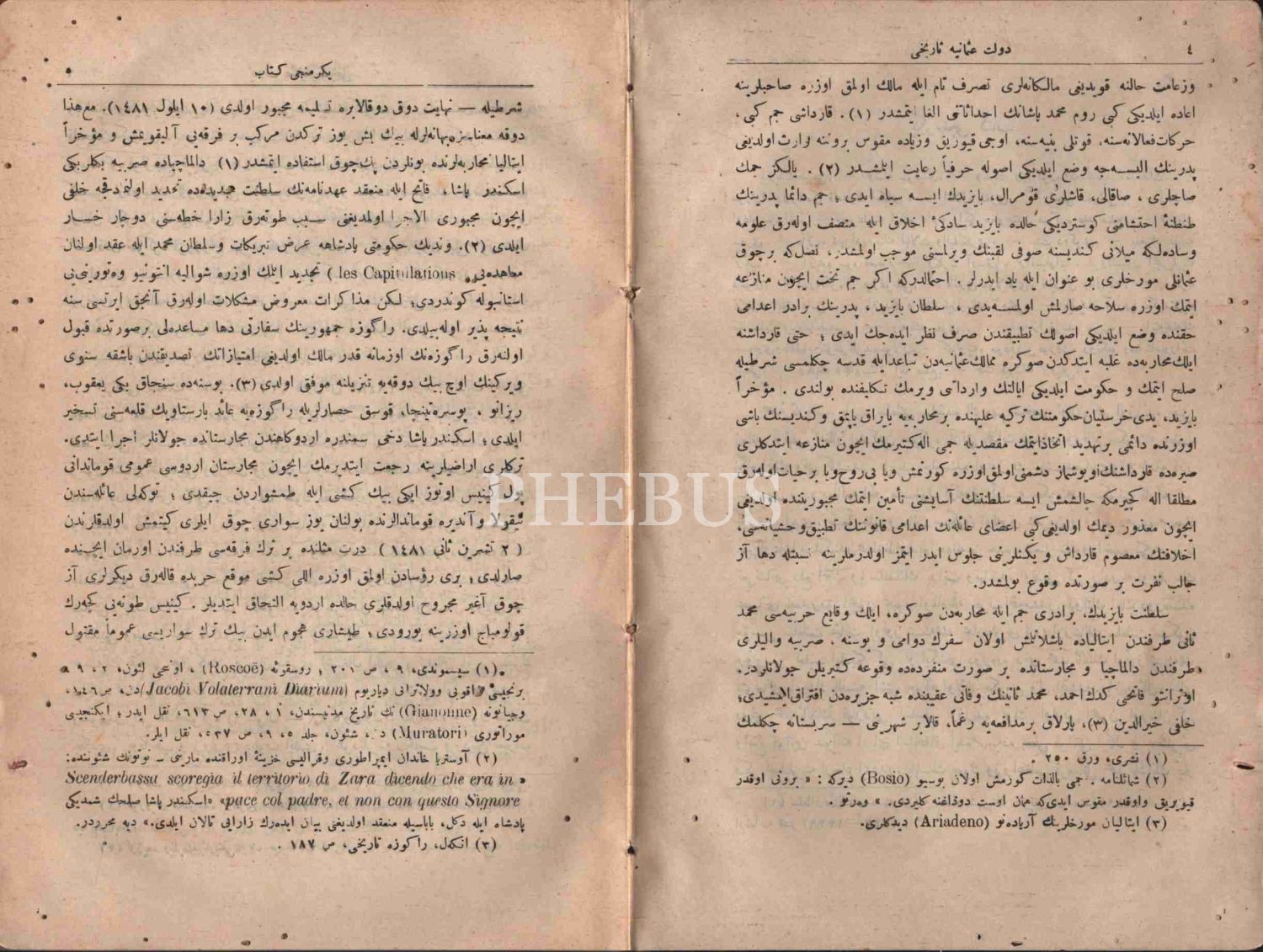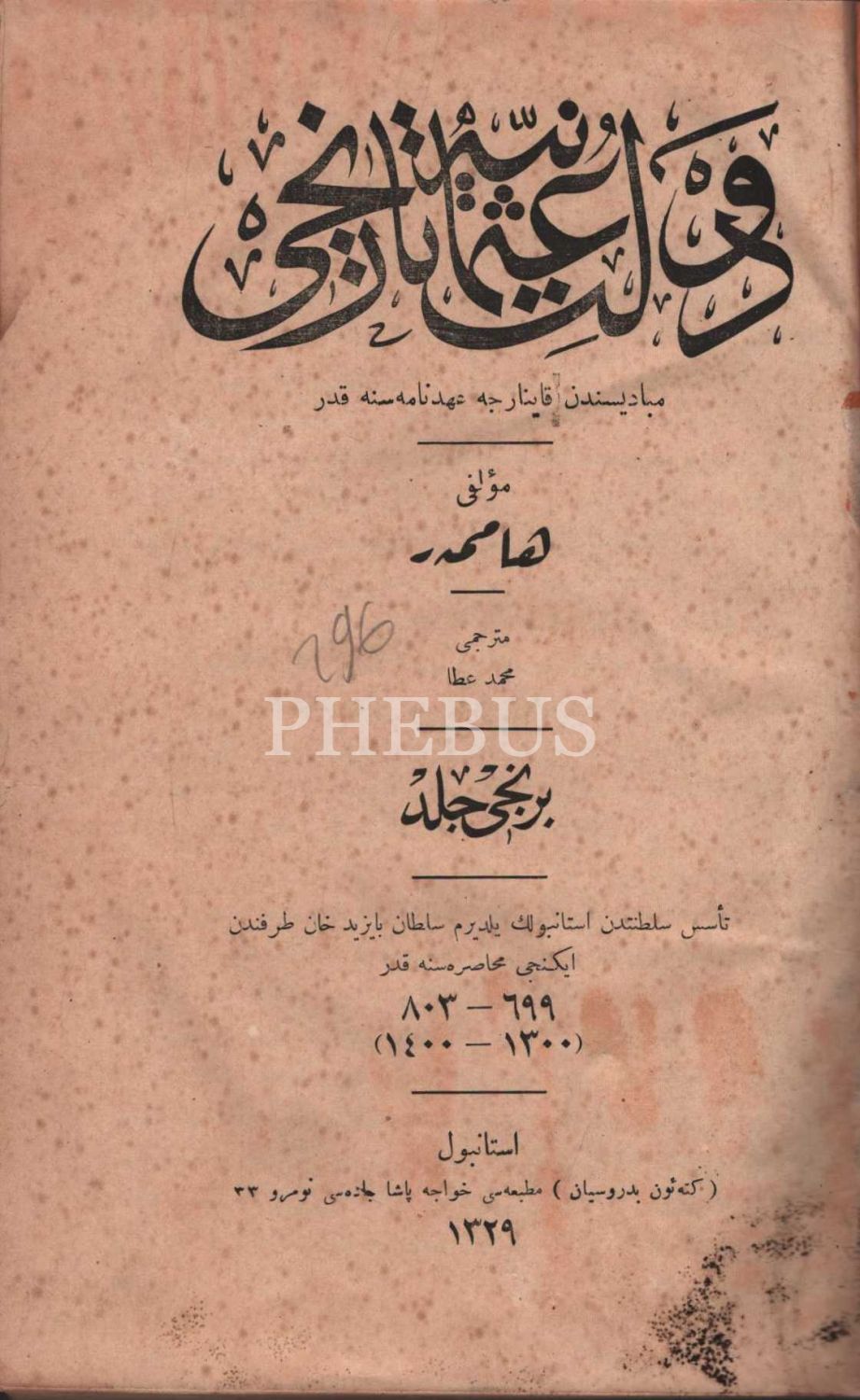 1. Cilt: Teessüs-i Saltanatdan İstanbul´un Yıldırım Sultan Bayezid Han Tarafından İkinci Muhasarasına Kadar (699-403, 1300-1400); 4. Cilt: Bayezid-i Sani´nin Biraderi Şehzâde Cem´in İrtihalinden Selim-i Evvel´in Vefatına Kadar (899-926, 1494-1520) / 4. cildin kapak ve sayfalarında kurt yeniği vardır.