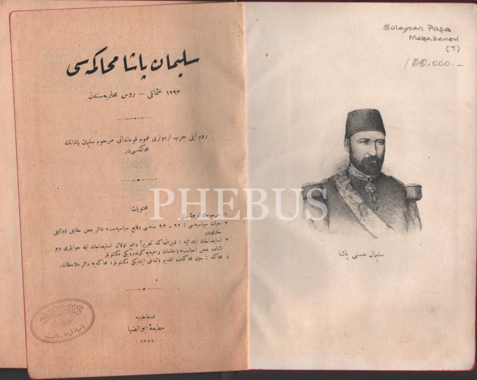 SÜLEYMAN PAŞA MUHÂKEMESİ (1293 Osmanlı-Rus Muhârebesinden), Matbaa-i Ebuzziya, İstanbul 1328, 160+16 sayafa, 16x23 cm…