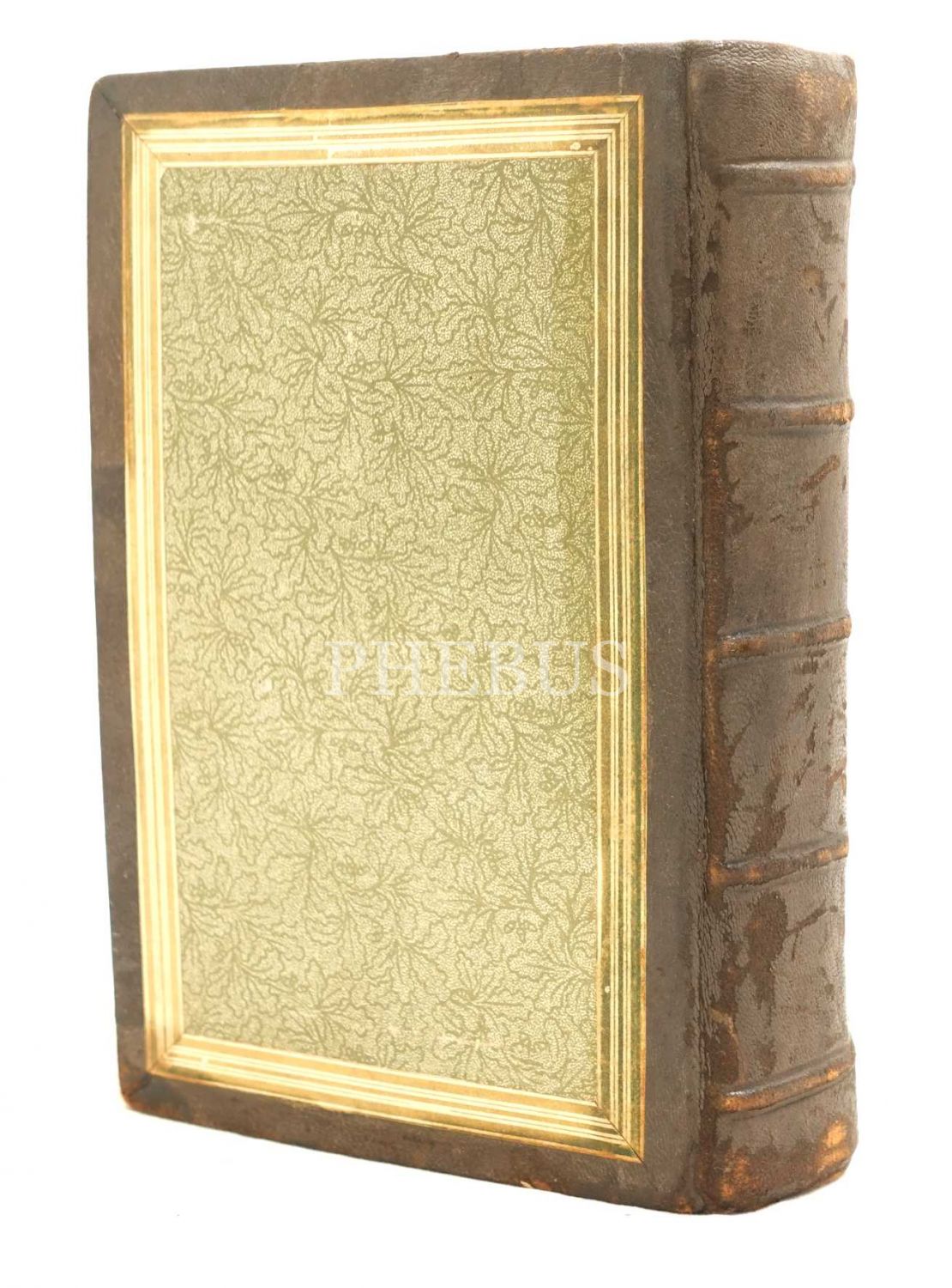 Ön ve arka yüzüne yaldızlı çerçeveli kâğıt yapıştırılmış, deri cilt içinde…