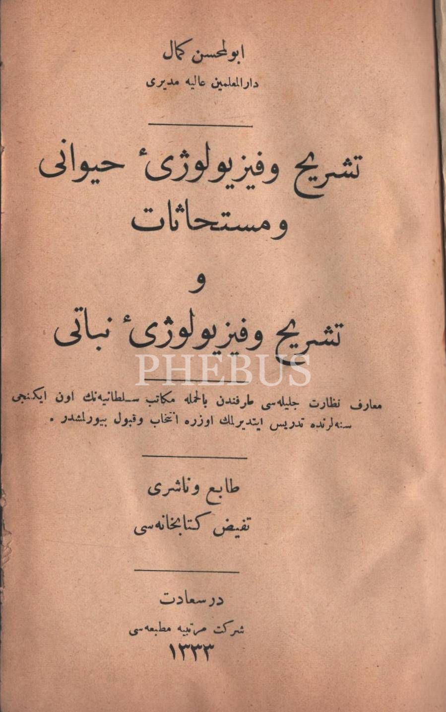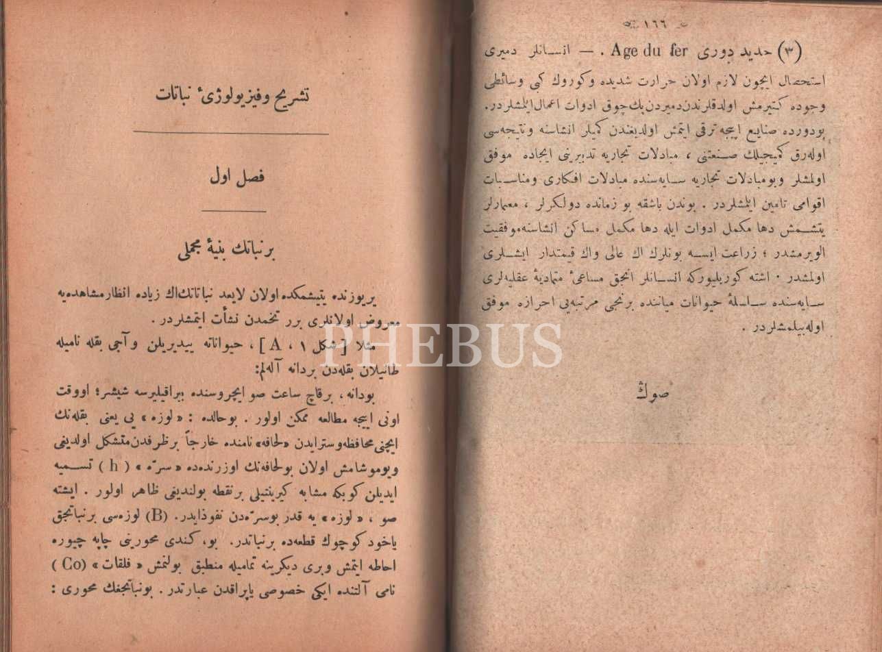 Aynı ciltte iki kitap: TEŞRİH VE FİZYOLOJİ - HAYVANÎ, Ebülmuhsin Kemal, 1333, Şirket-i Mürettibiye Matbaası, 166 sayfa, TEŞRİH VE FİZYOLOJİ NEBATİ (Künye sayfası eksik.) 206 sayfa, 13x19 cm…