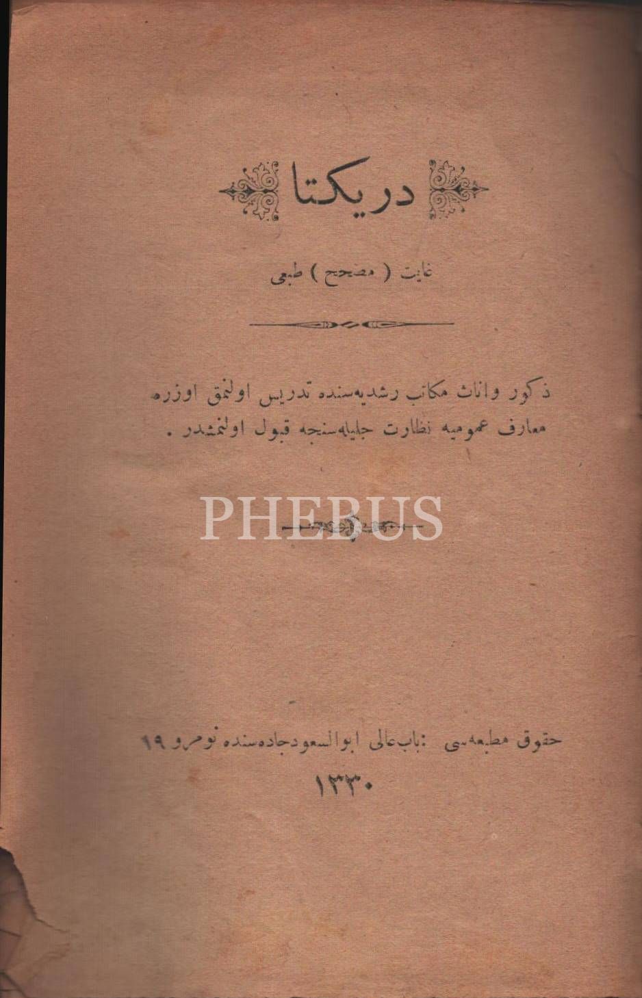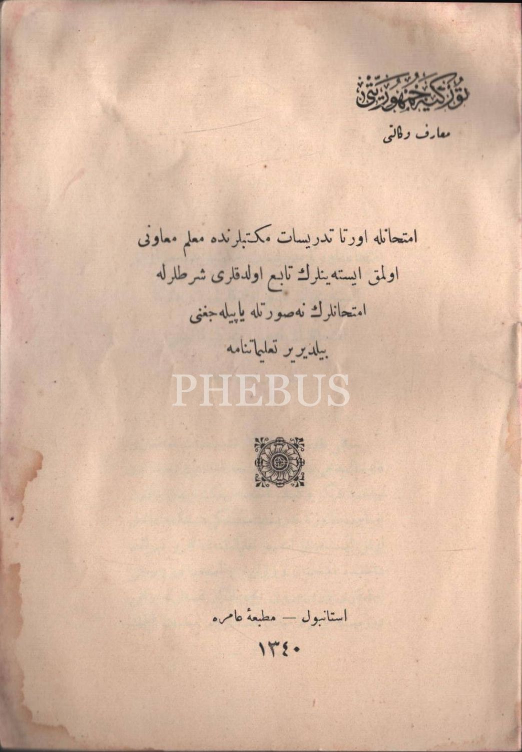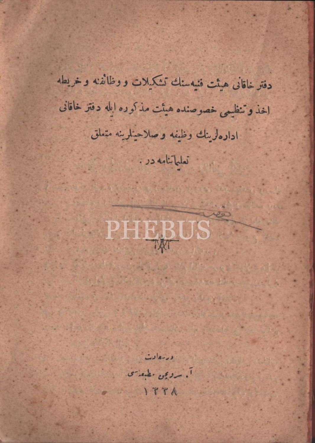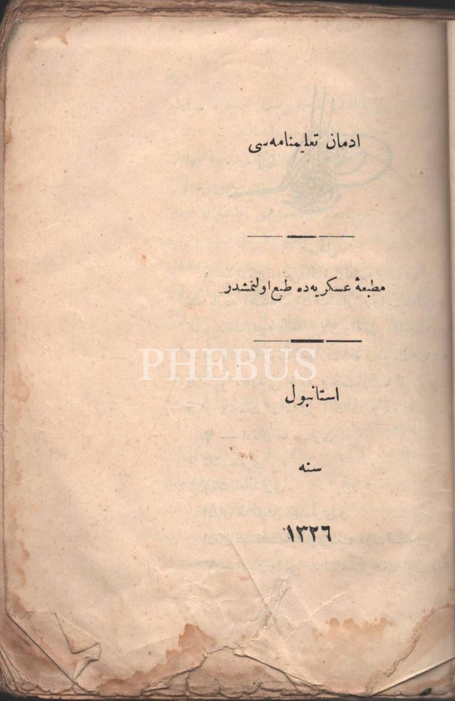 MAARİF EMİNLİKLERİ TALİMATNAMESİ, 1926, 16 Sayfa, DEFTER-İ HAKANİ HEYET-İ FENNİYESİNİN TEŞKİLAT VE VEZAİFİNE… TALİMATNAMEDİR, 1338, 56 sayfa, TİCARET-İ BAHRİYE MÜDİRİYETLERİ MEMURİN VE MÜSTAHDİMİNİNE MAHSUS RÜTBE ALAMET-İ FARİKALARI, ŞAPKA VE ELBİSE TALİMATNAMESİ, 1341, 8 sayfa, İMTİHANLA ORTA TEDRİSAT MEKTEBLERİNDE MUALLİM MÜVEZZİ OLMAK İSTEYENLERİN TABİ OLDUĞU ŞARTLARLA İMTİHANLARIN NE SURETLE YAPILACAĞINI BİLDİRİR TALİMATNAME, 1340, 12 sayfa, İDMAN TALİMATNAMESİ, 1339, 188 sayfa, LAYİHA-YI ISLAHAT-I UMUMİYE, 1327, 12 sayfa, AŞAR VE AĞNAM MEMURLARININ VEZAİFİNİ MEBİN TALİMATNAMEDİR, 1295, 20 SAYFA...