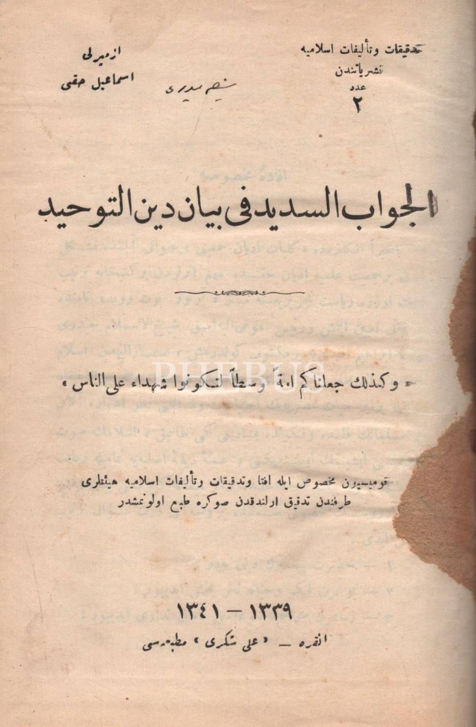 EL-CEVÂBÜ´S-SEDÎD FÎ BEYÂN-I DÎNİ´T-TEVHÎD, İzmirli İsmail Hakkı, Ali Şükrü Matbaası, Ankara 1339-41, 280 sayfa, 14x20 cm...