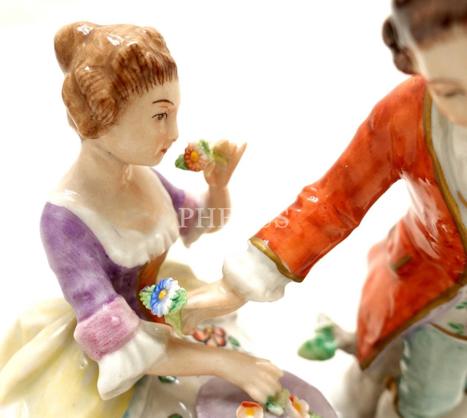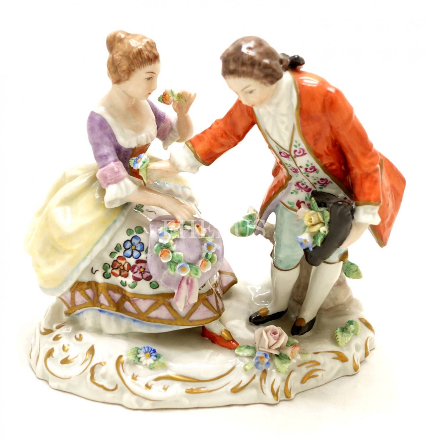 Çiçek buketleriyle ilgilenen çift temalı, altın yaldızlı ve damgalı porselen biblo, 14x12x7 cm