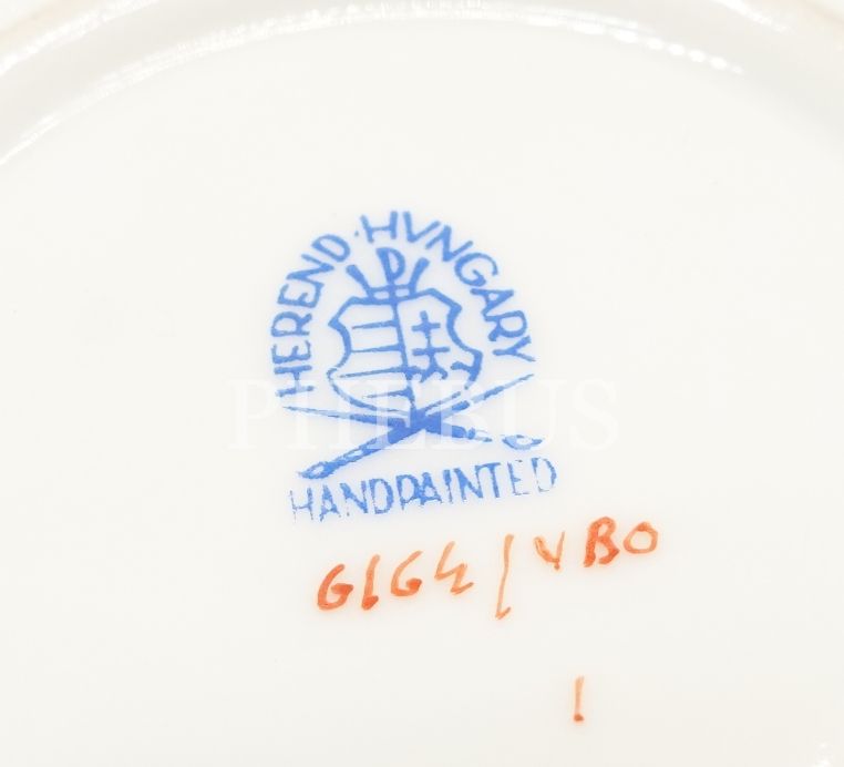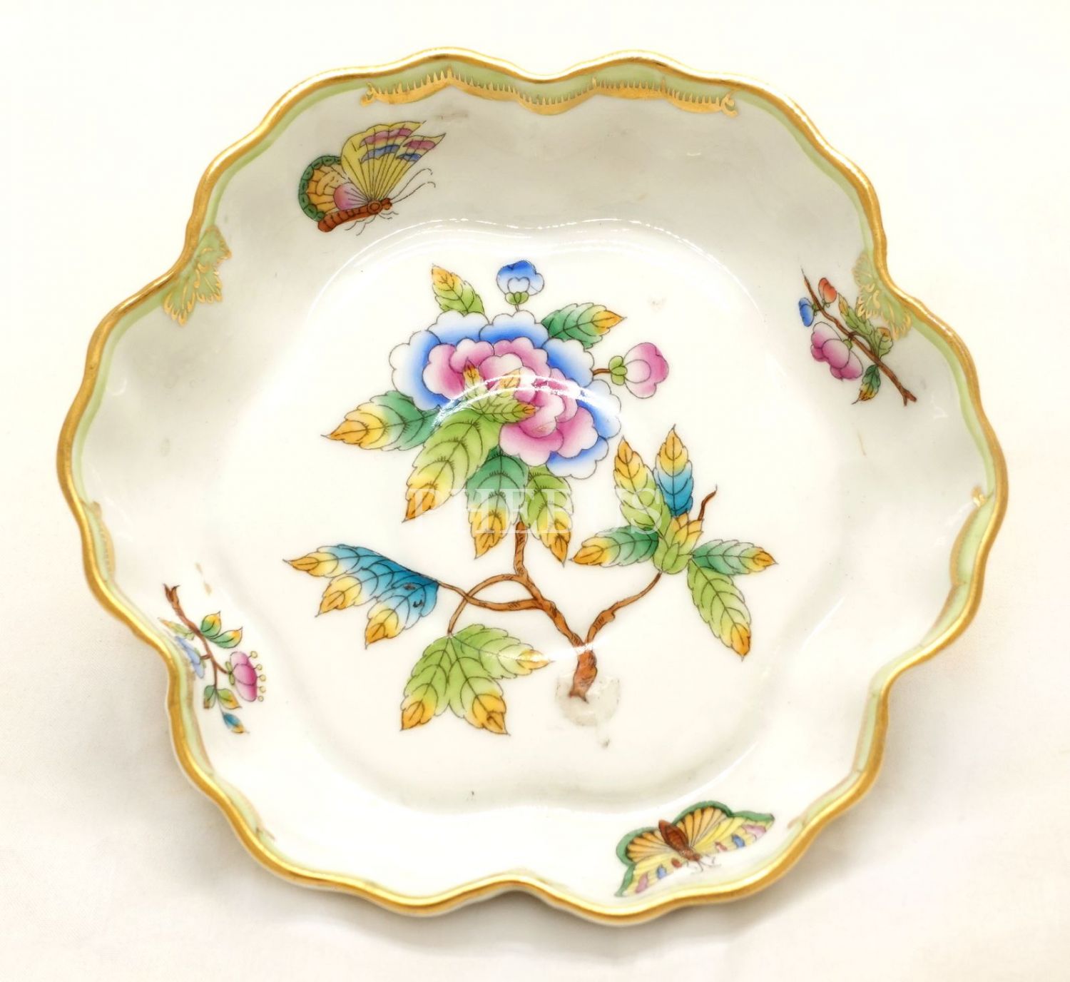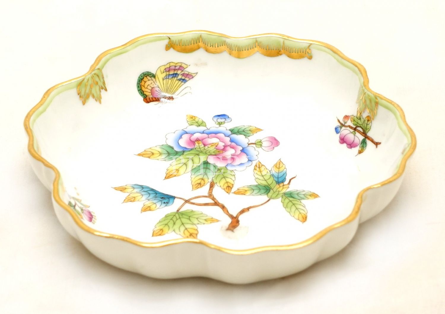 Herend Hungary damgalı, çiçekli yapraklar ve kelebek motifli, altın yaldızlı porselen şekerlik, 14x3 cm
