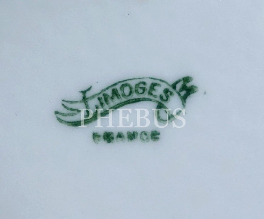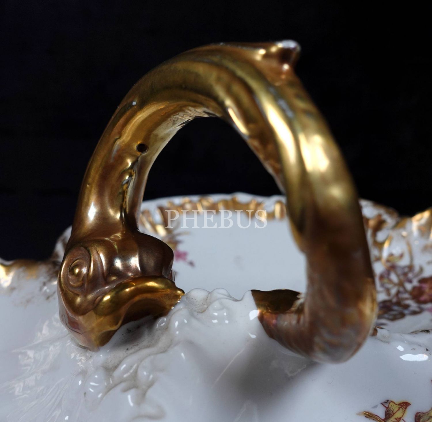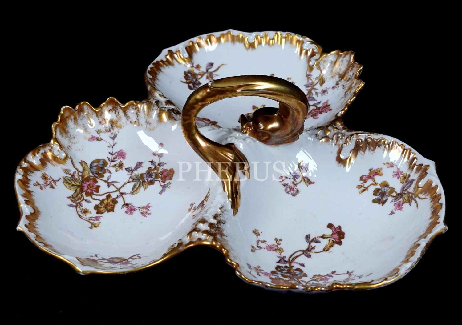 Balık formundaki kulbu ile dikkat çeken, çiçek motifleriyle bezeli, altın yaldızlı Limoges çerezlik, 33x6 cm