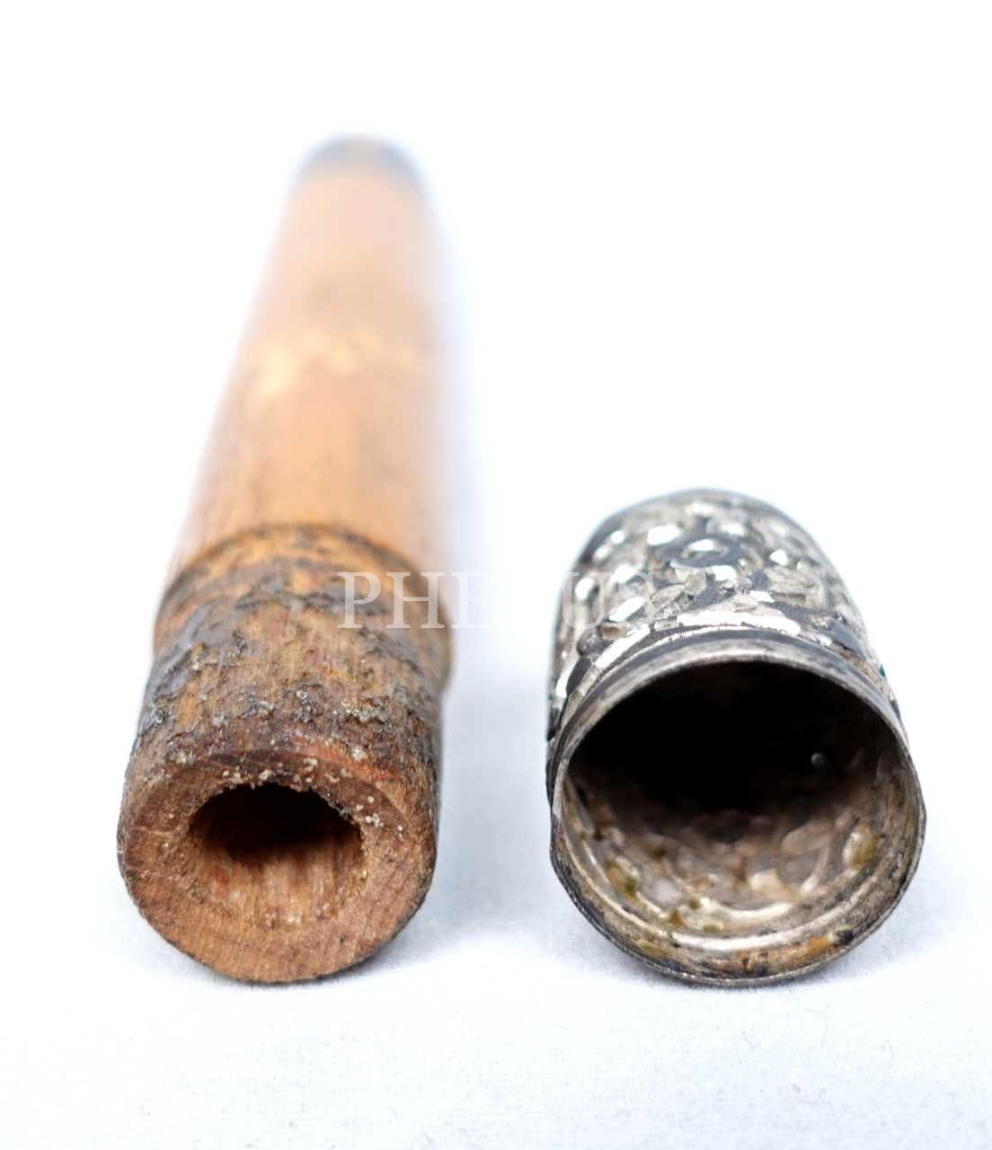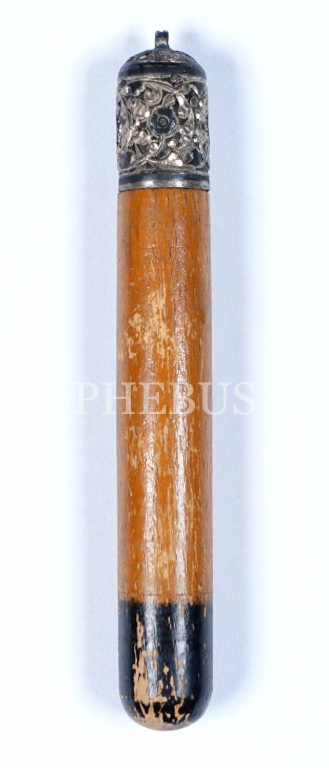 Ahşap formda iki adet gazyr tüpü, tüplerin kapakçıklarında gümüş kakma yaprak motifi bulunmaktadır, 12x1 cm