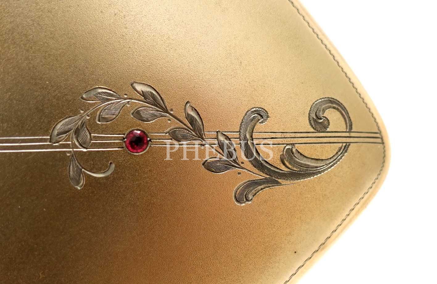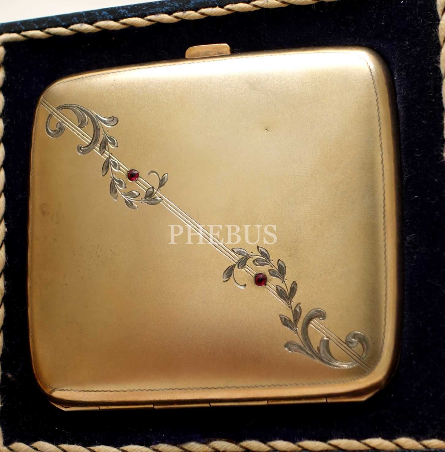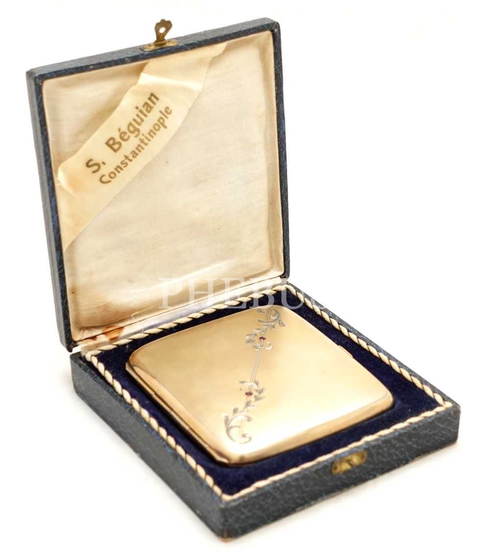 "S. Beguian - Constantinople" etiketli kutusunda, üzeri gümüş kakma çiçek motifi ile süslenmiş ve bir çift taş oturtulmuş tabaka, 9x8x1 cm tabaka