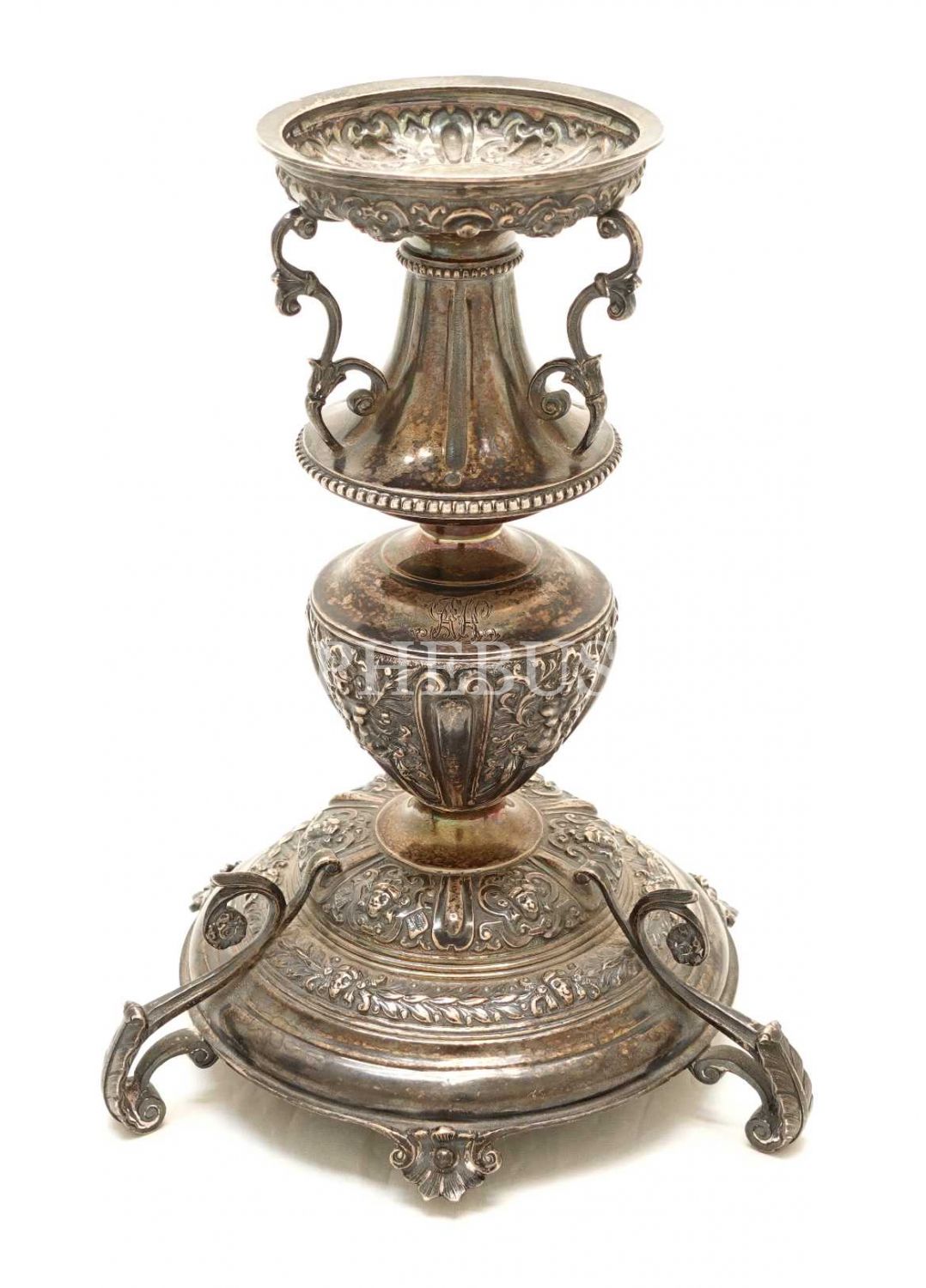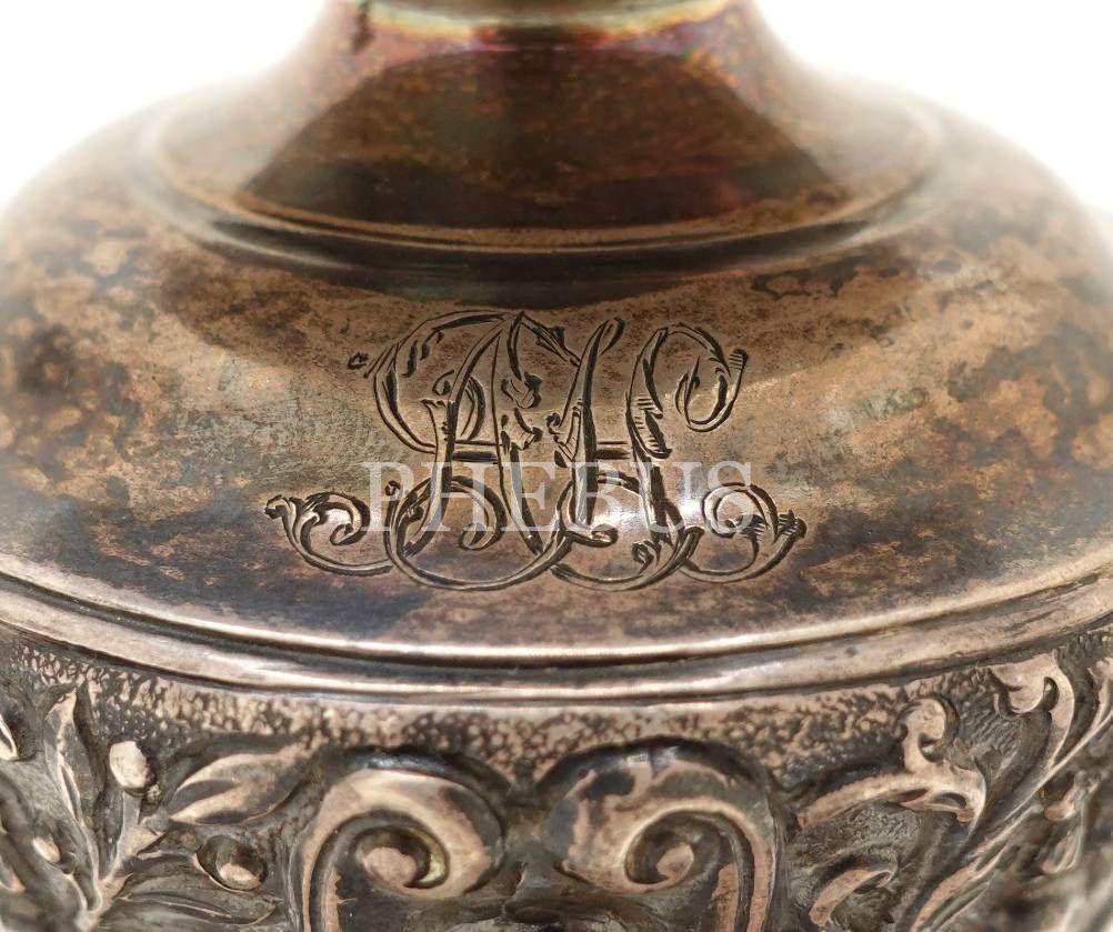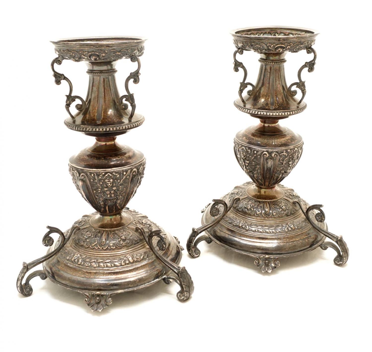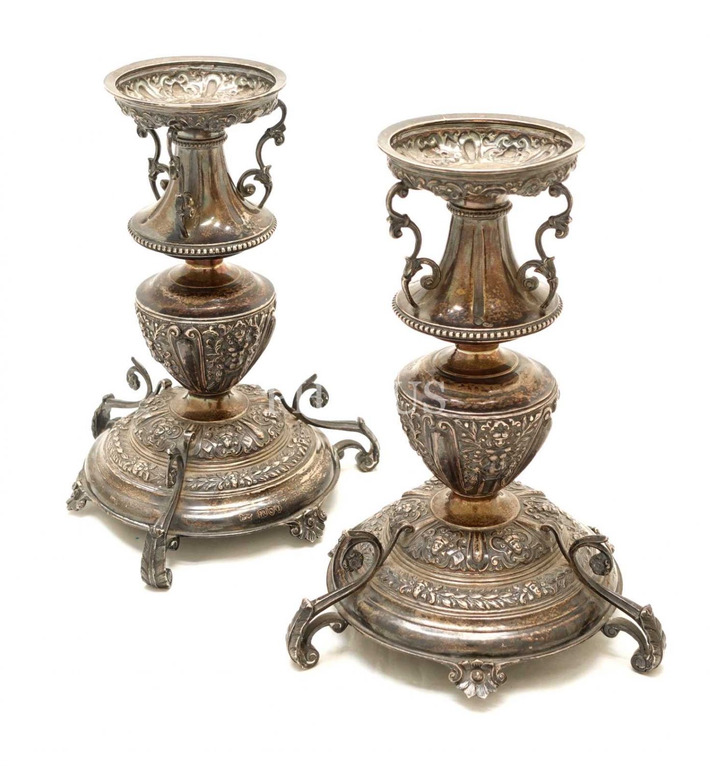 İngiliz "Mappin & Webb" mamulatı, gümüş üzeri kabartma çiçek motifleri ve kadın suretleri ile süslenmiş, "A. H." inisiyalli çift şamdan, 21x15 cm, toplam ağırlık 884 g