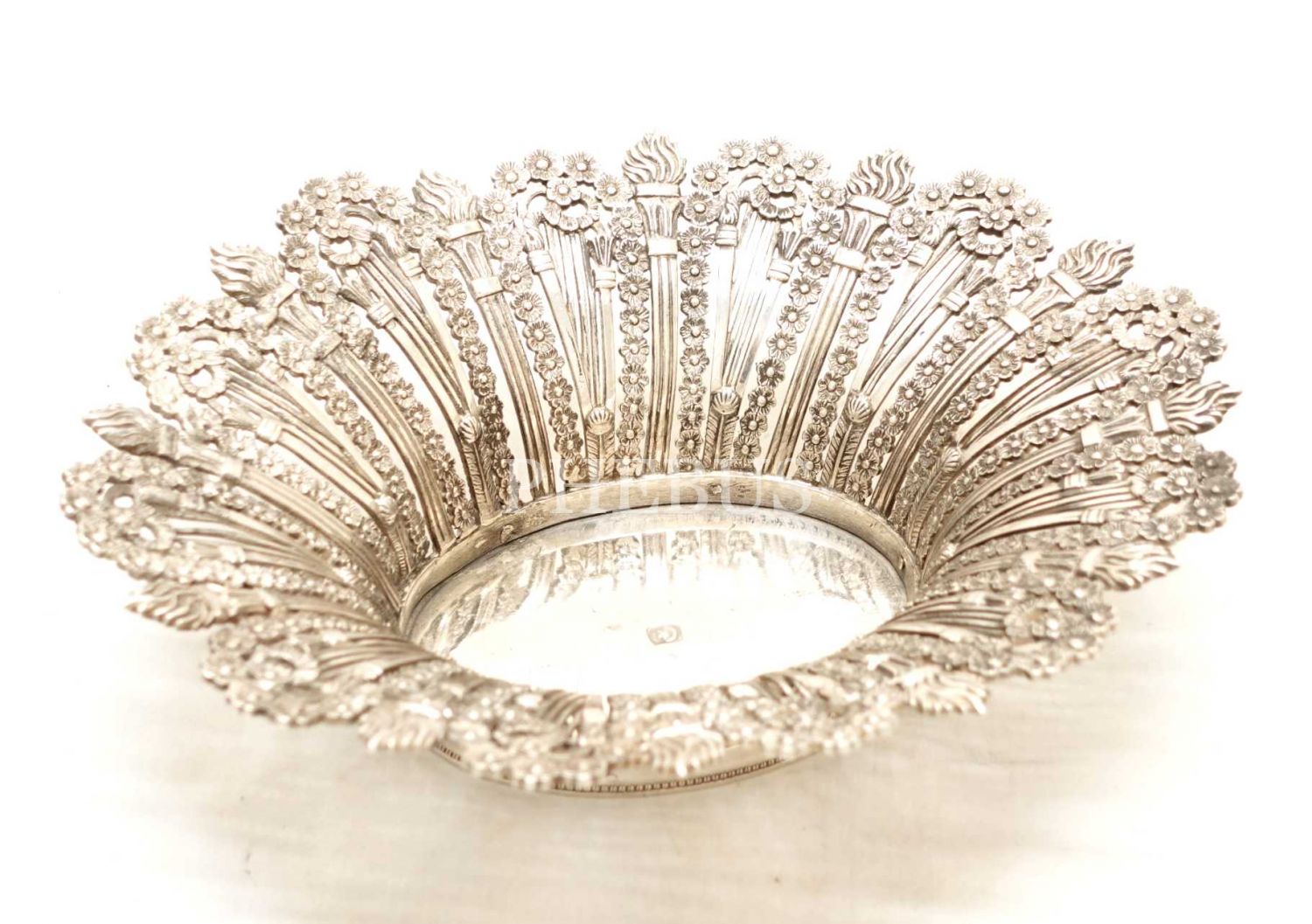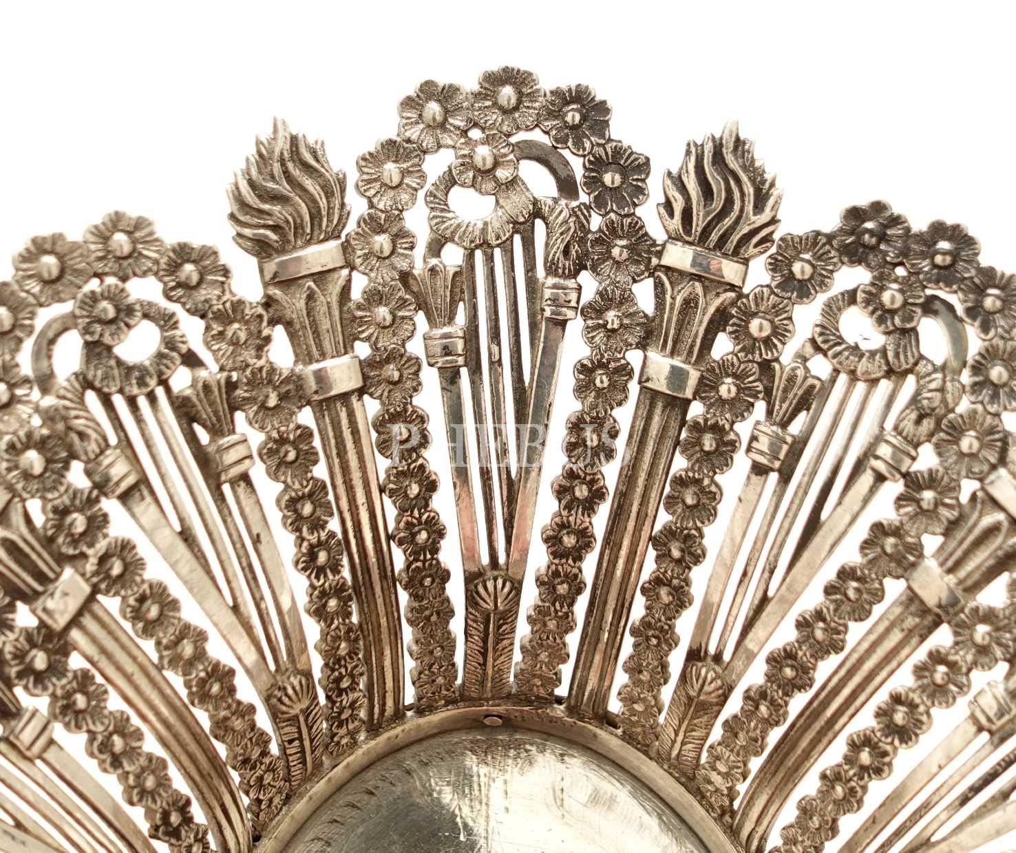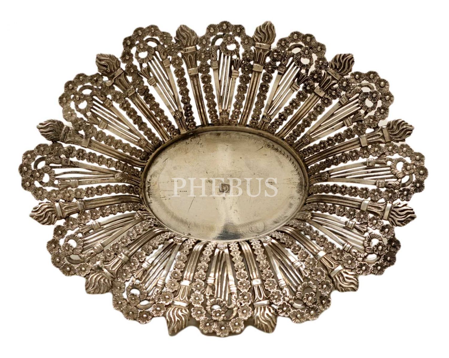 Ay yıldız damgalı, meşale ve çiçek desenleriyle bezeli, Sultan Vahdeddin dönemi gümüş lokumluk, 437 g, 19x15x6 cm