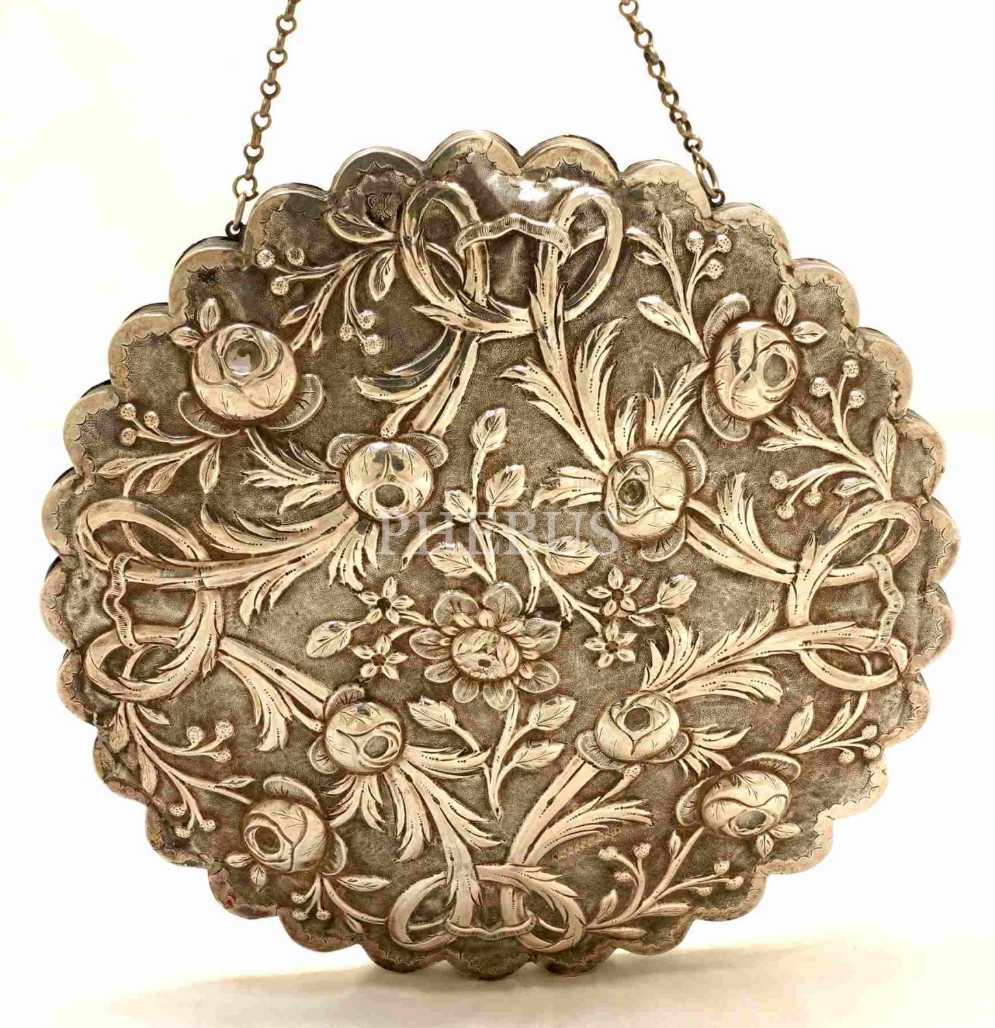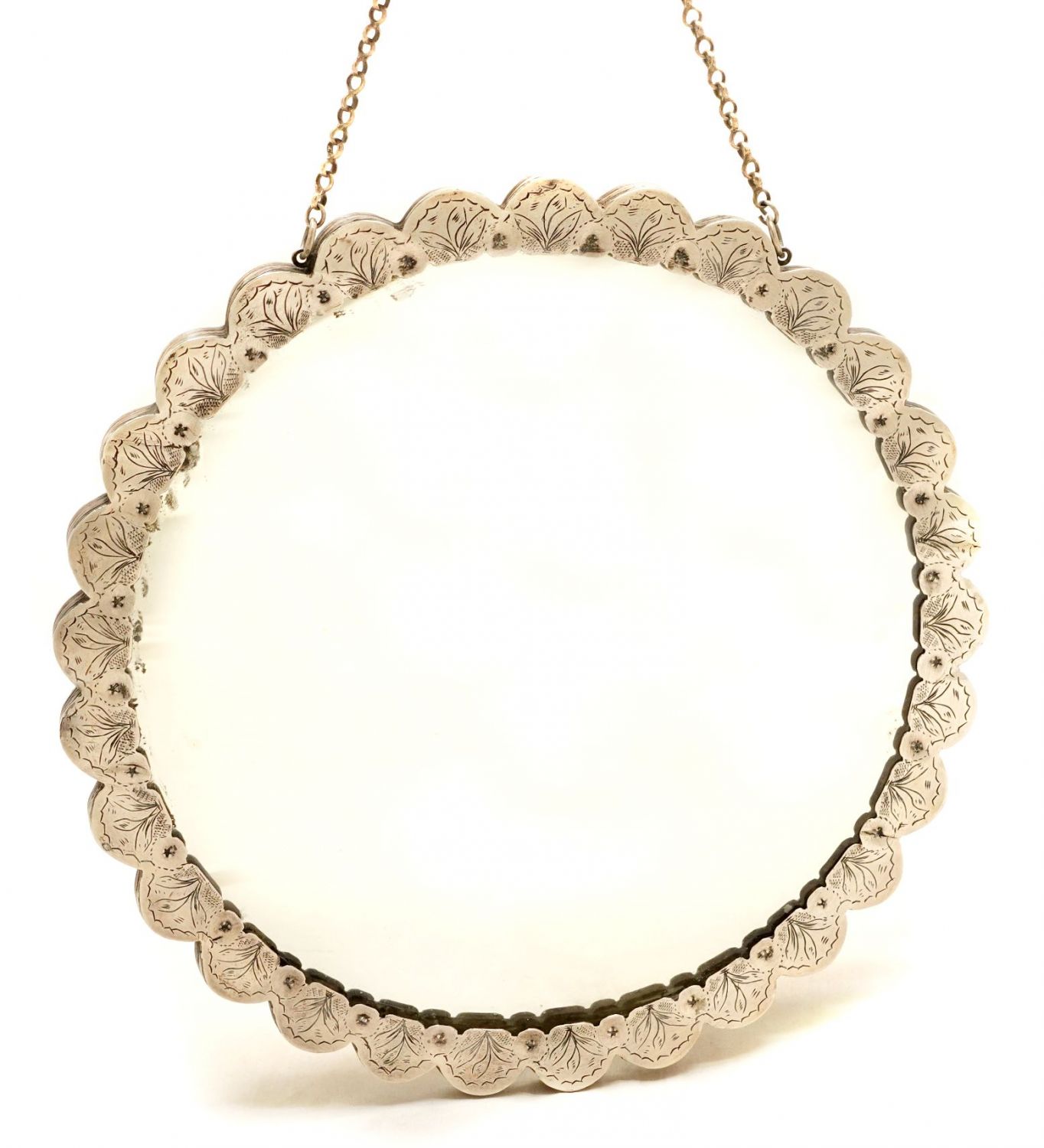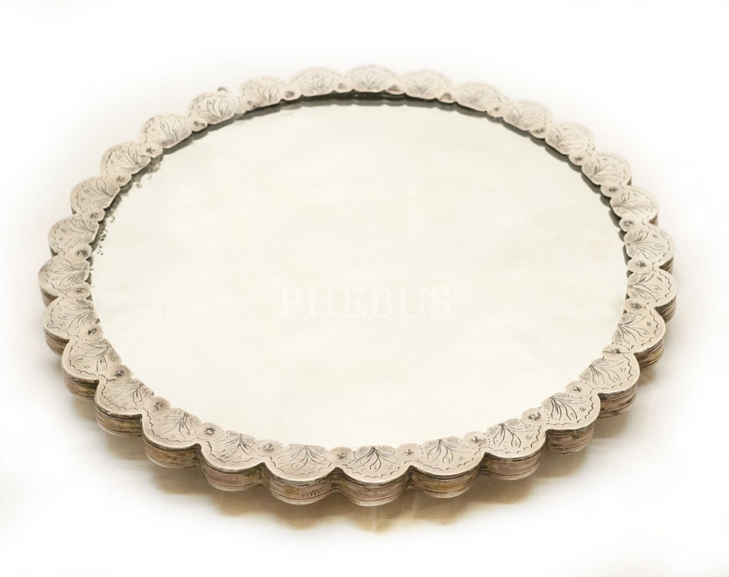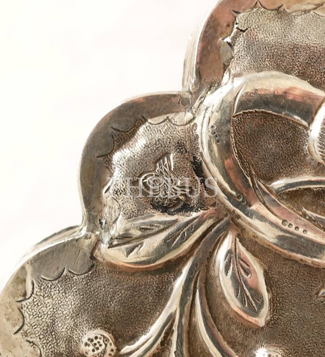 Osmanlı tuğralı, kabartma ve kalem işçilikli floral motiflerle bezeli gümüş ayna, 20x1 cm