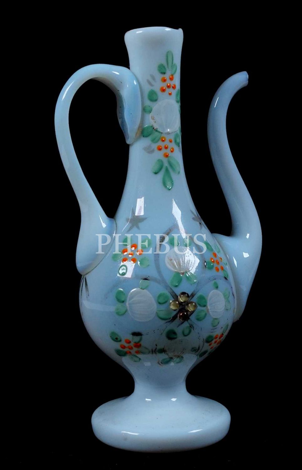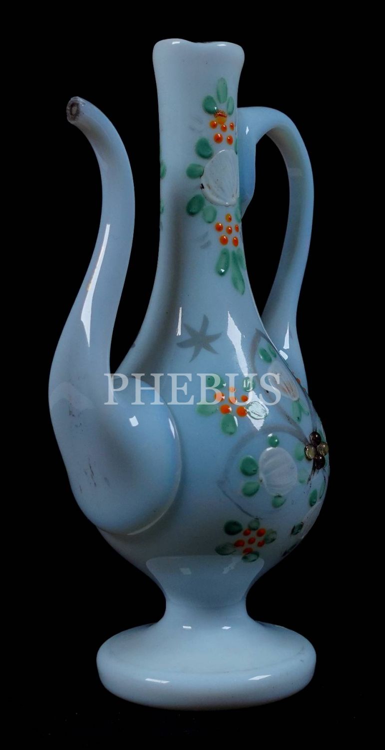 19 yüzyıl Beykoz imalatı, opalin üzeri bitki motifleriyle bezeli ibrik, 19 cm