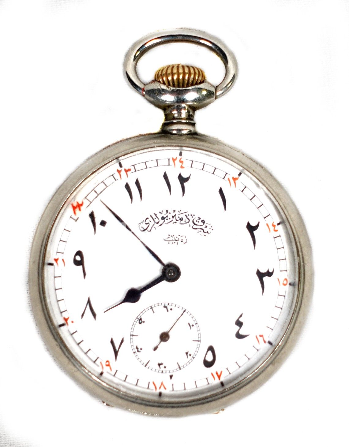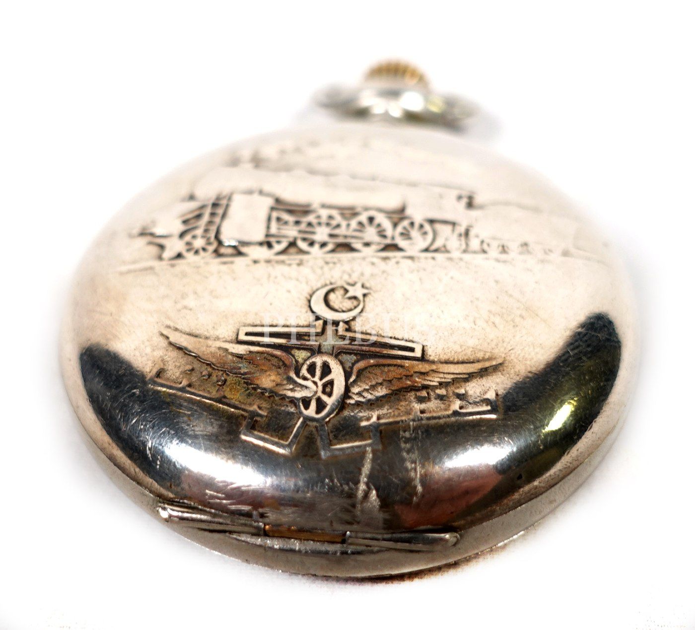 Kadranında Osmanlıca "Şark Demiryolları" yazısı bulunan, Zenith marka köstekli saat, arka yüzünde "Şark Demiryolları" monogramı ve tren kabartması mevcut, çap 5 cm