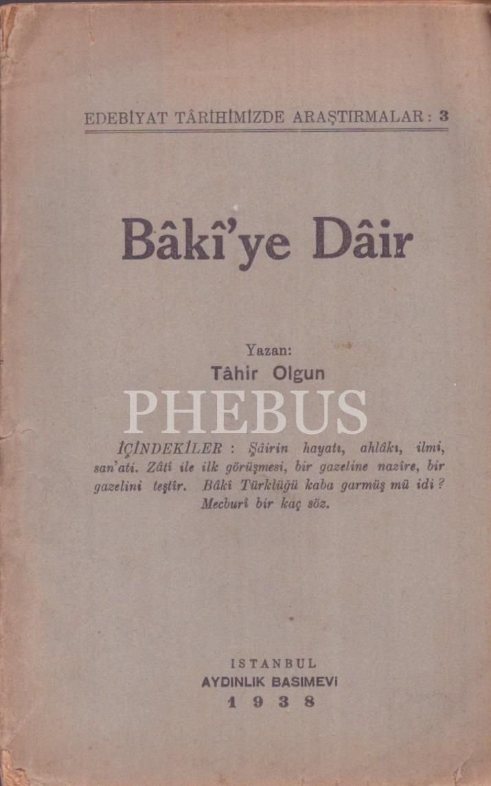 BÂKδYE DÂİR, Tâhir Olgun, İstanbul 1938, Aydınlık Basımevi, 96 sayfa...
