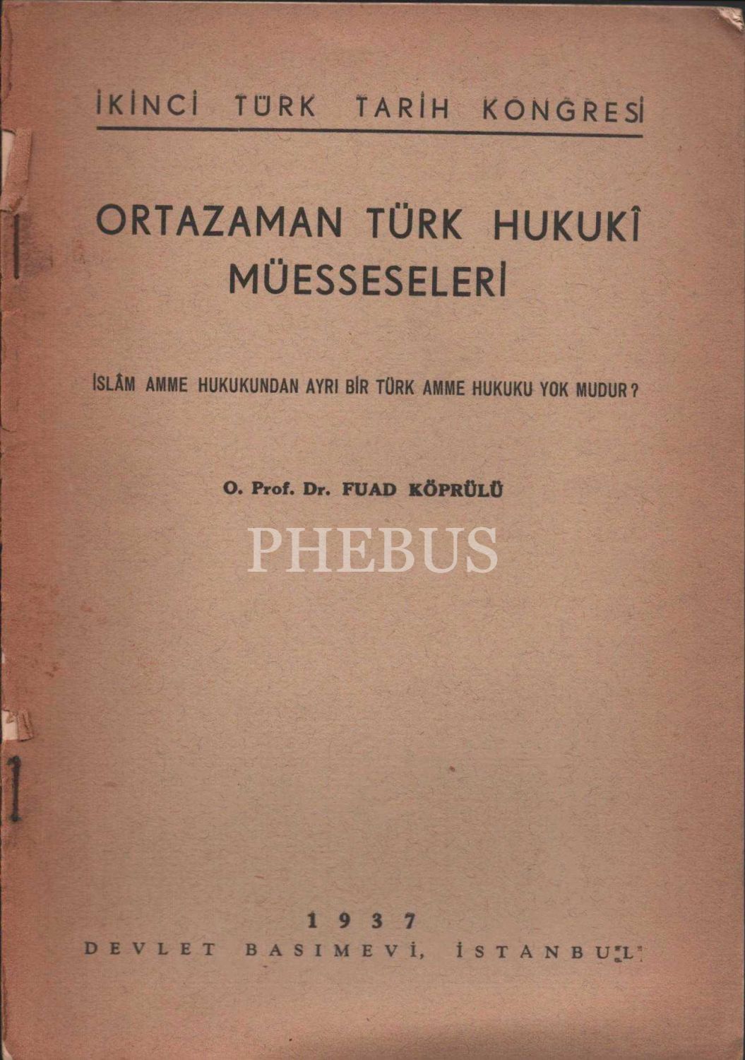 ORTAZAMAN TÜRK HUKUKÎ MÜESSESELERİ, O.Prof.Dr.Fuad Köprülü, İstanbul 1937, Devlet Basımevi, 34 sayfa...