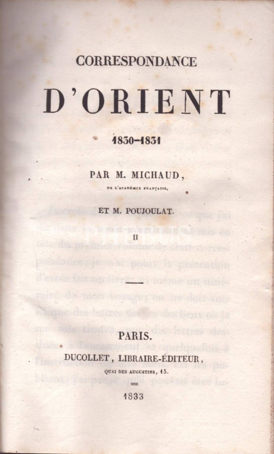 Doğu´da Haçlı Seferleri´nin izlerini arayan iki Fransız tarihçinin yazışmaları: CORRESPONDANCE D´ORIENT (1830-1831), M. Michaud & M. Poujoulat, Paris - 1833, 416 sayfa, 13x21 cm
