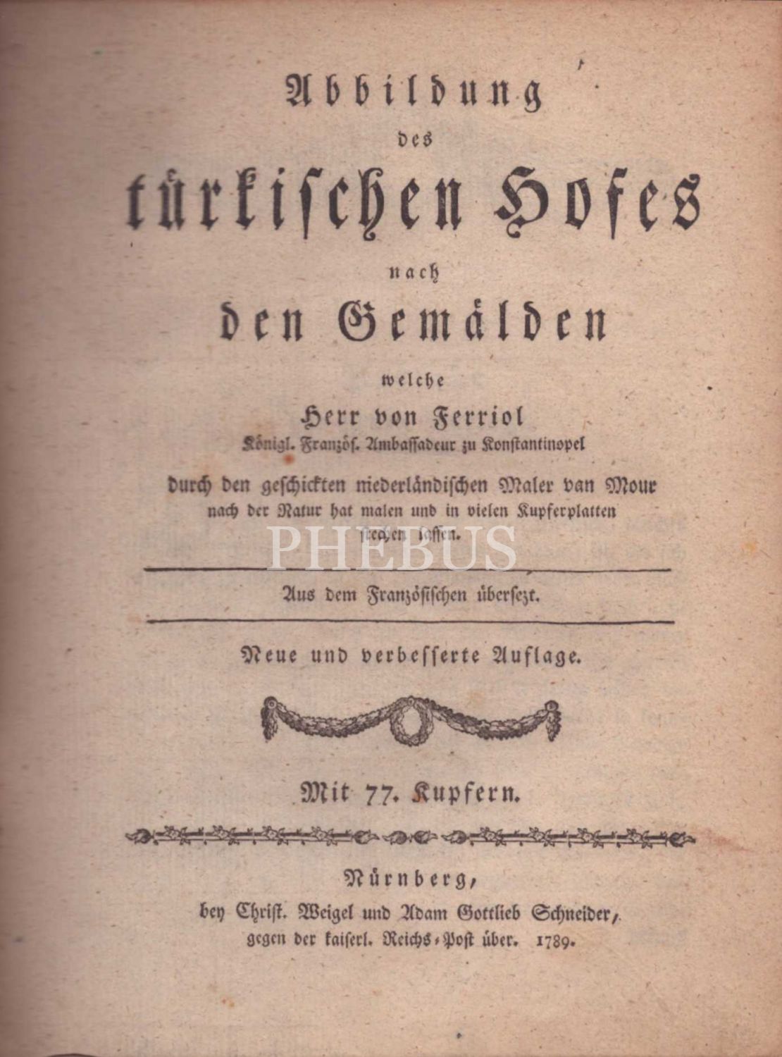 1692-1711 yılları arasında Fransa´nın Osmanlı büyükelçisi olarak görev yapan Charles de Ferriol´un anlatımı ve Jean-Baptiste Vanmour´un 77 adet bakır levhasıyla 1789 baskı ABDILDUNG DES TÜRKISCHEN HOFES, 136 sayfa, 17x22 cm