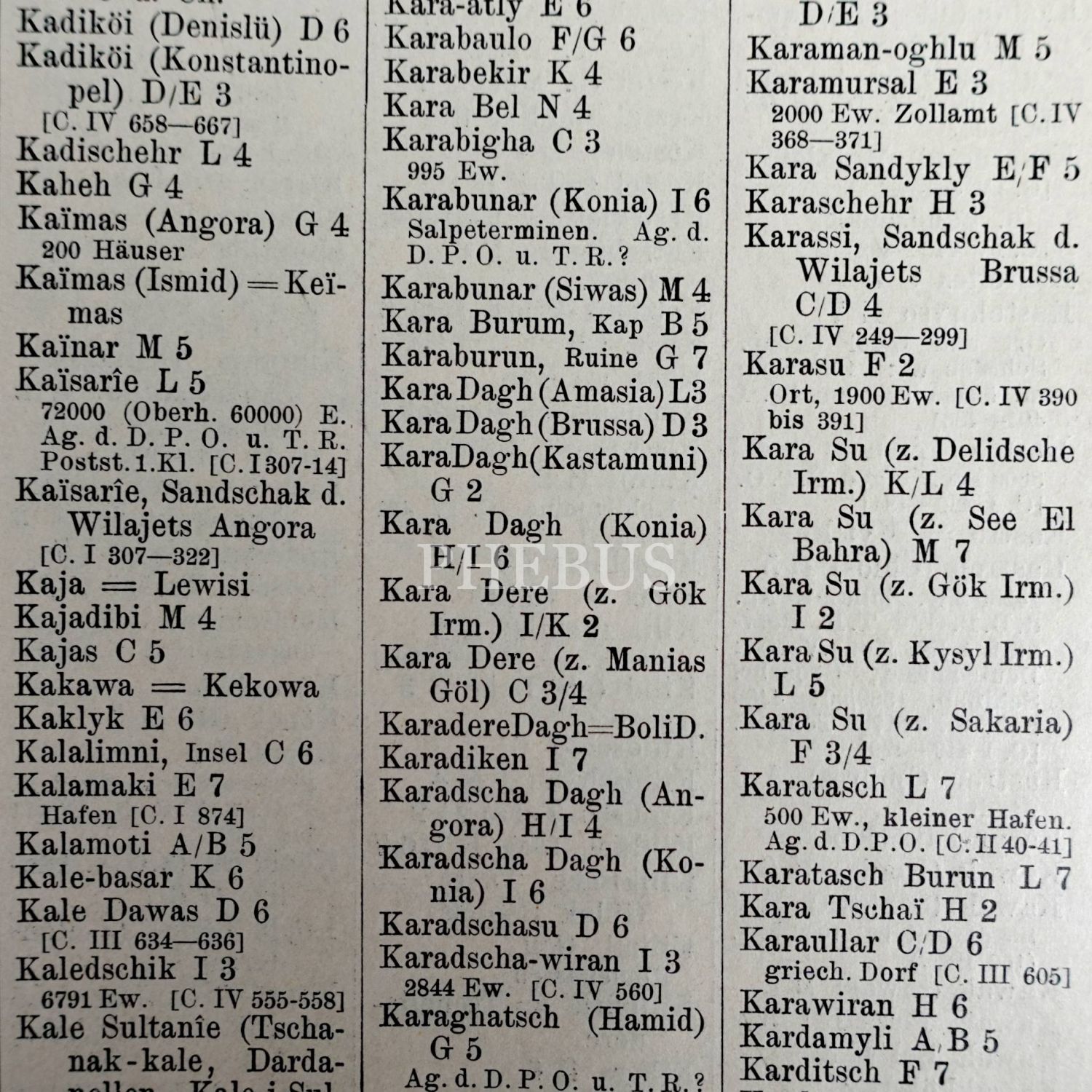 Ön kapağında “Librairie Internationale OTTO KEIL / Grand’ rue de Pera - Constantinople” etiketi bulunan çalışmanın ayrıntılı indeksinde Küçük Asya’da [Anadolu] yer alan Türkçe il ve ilçe isimlerinin Almanca fonetiğe uygun karşılıkları yer almaktadır. Örn: Gjök Dagh (Gök Dağ) - Tschibuk Owa (Çubukova). Katlanır harita 43x55 cm boyutundadır.