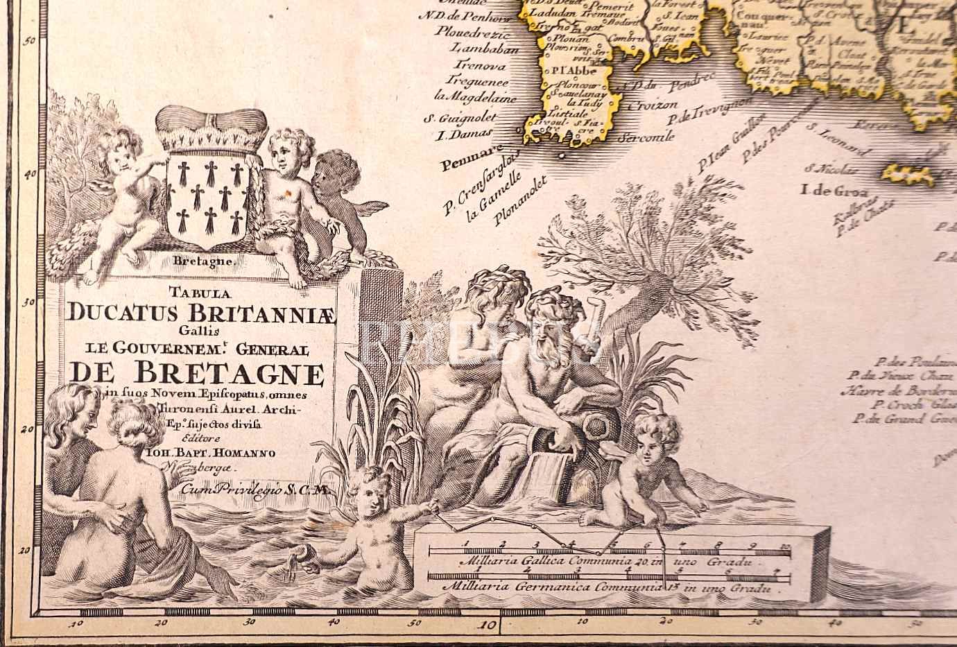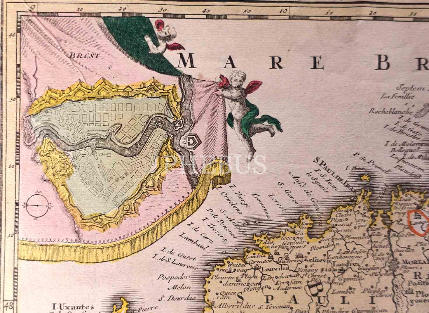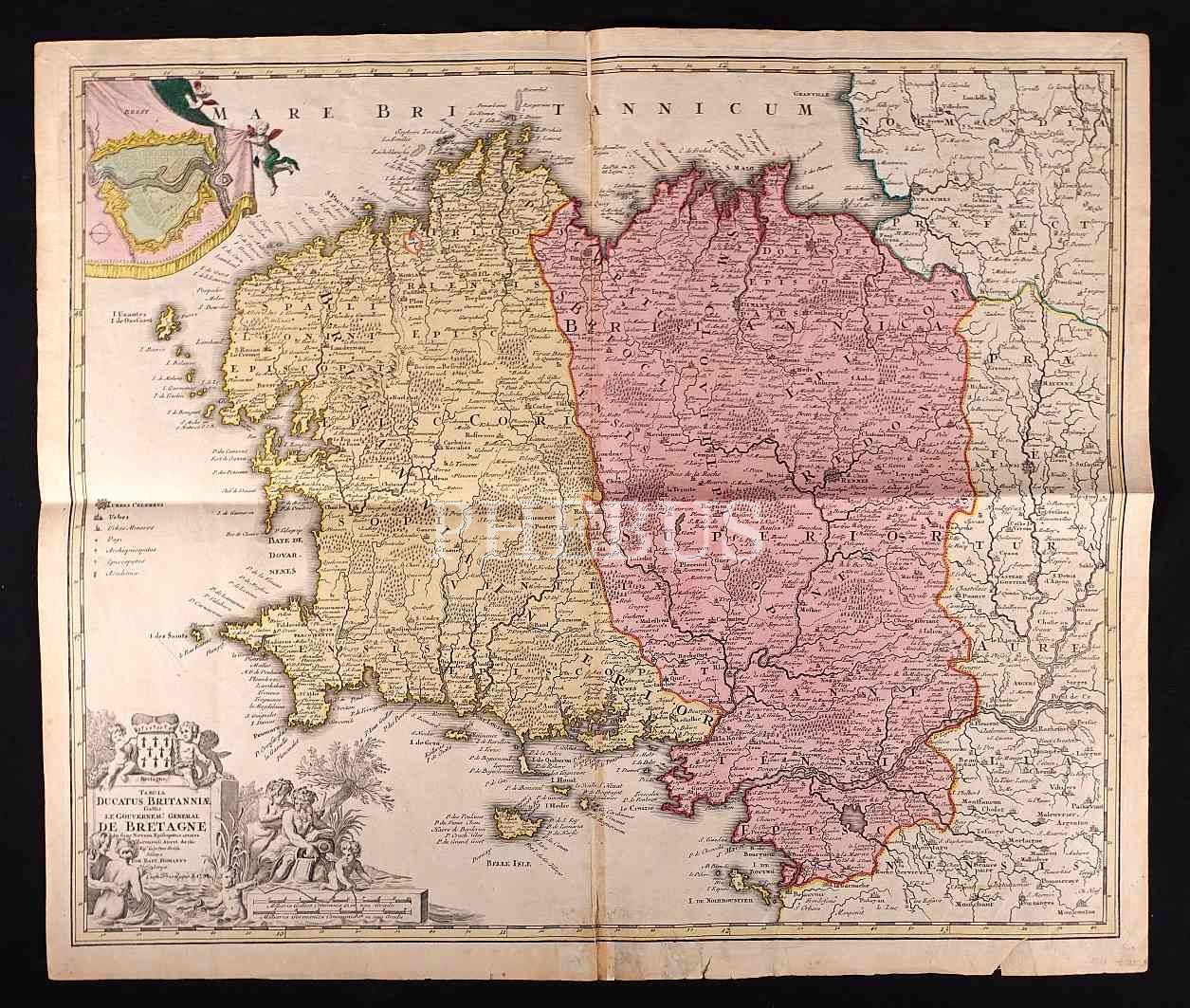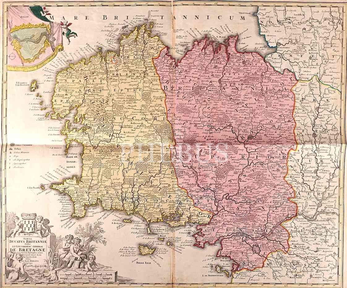 Yukarı ve aşağı Britanya (Breton ve Gallo) arasındaki dilsel sınırını gösteren 17. yüzyıl harita gravürü, 51x60 cm