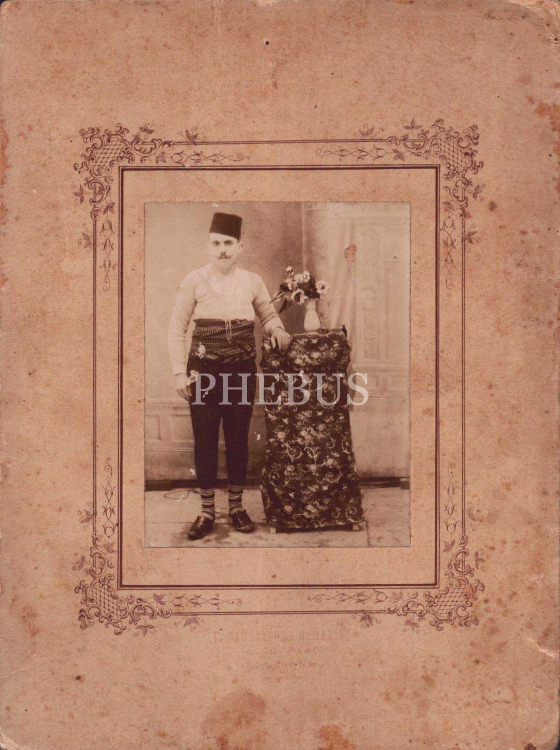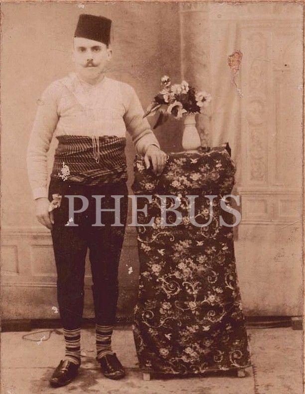 Yöresel kıyafetli fesli beyefendinin paspartuya yapıştırılmış stüdyo hatıra fotoğrafı, paspartuda Rumca fotoğrafhane damgası mevcuttur. 17x22 cm
