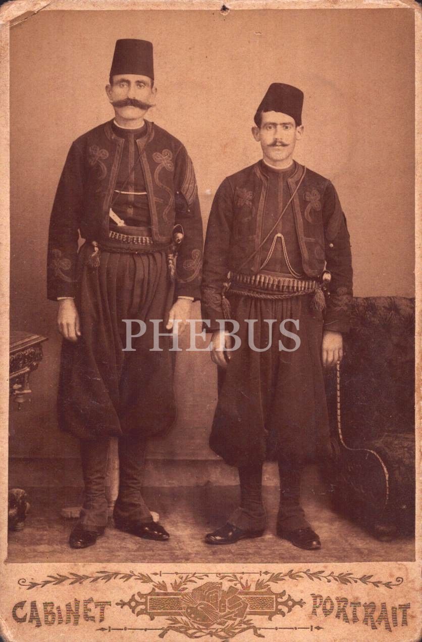 Kuşaklarına mermi kemeri bağlı iki yöresel kıyafetli ve fesli beyefendinin stüdyo hatıra kabin fotoğrafı, Bağdat - 1315, 11x16 cm