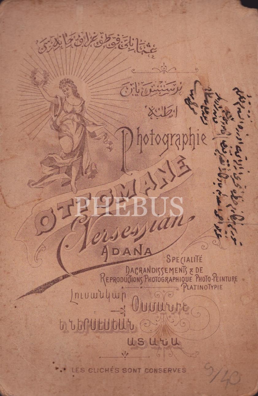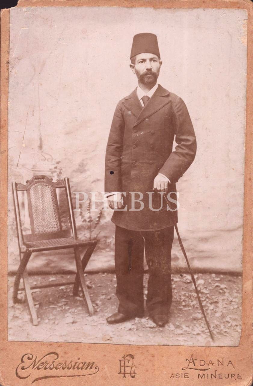 Bastonlu ve şık giyimli fesli beyefendinin stüdyo hatıra kabin fotoğrafı, Photographie Ottomane / E. Nersessian (Adana - Asie Mineure), 11x16 cm