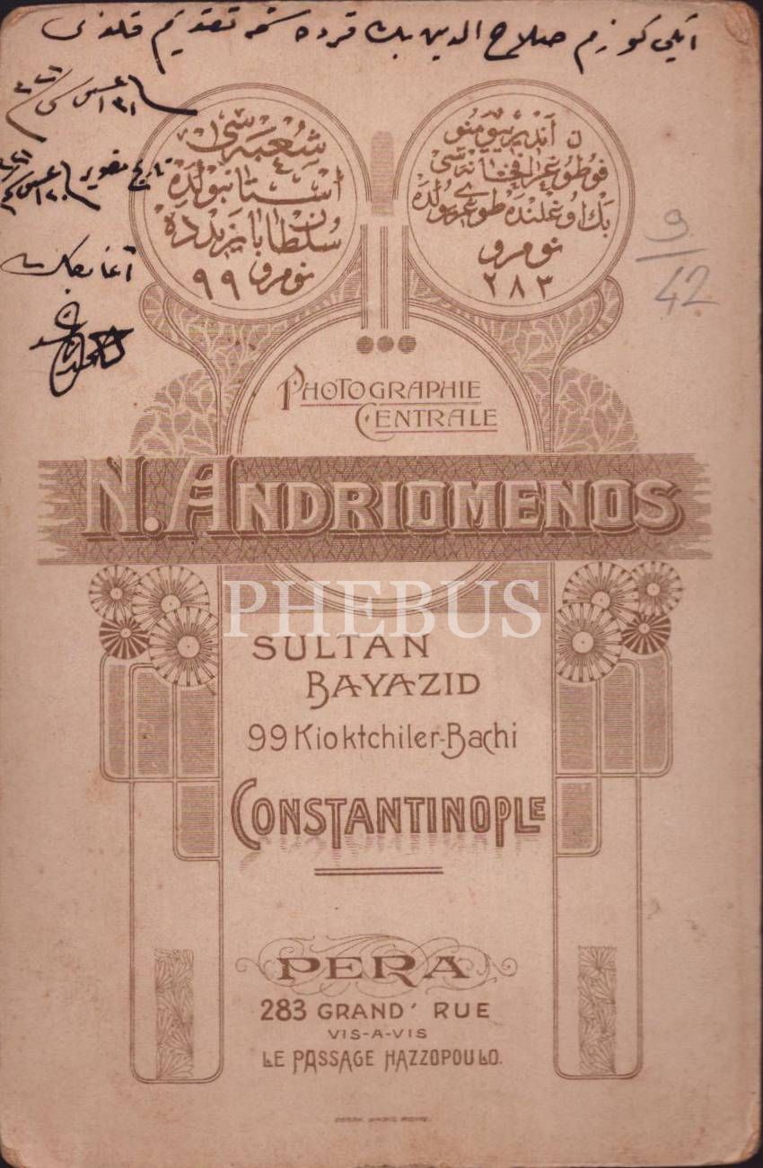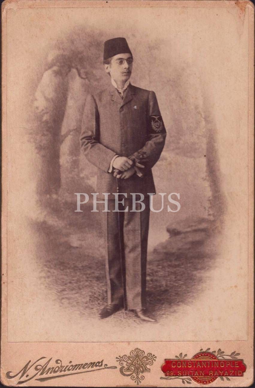 "R" yazılı ve kartal işlemeli pazubendiyle poz veren fesli genç beyefendinin stüdyo hatıra kabin fotoğrafı, Photographie N. [Nicolas] Andriomenos (Pera - Constantinople), 11x17 cm
