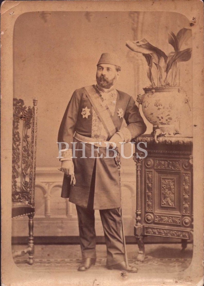 Altın sırmalı üniforması, kılıcı ve nişanlarıyla poz veren Osmanlı paşasının stüdyo hatıra kabin fotoğrafı, 10x15 cm