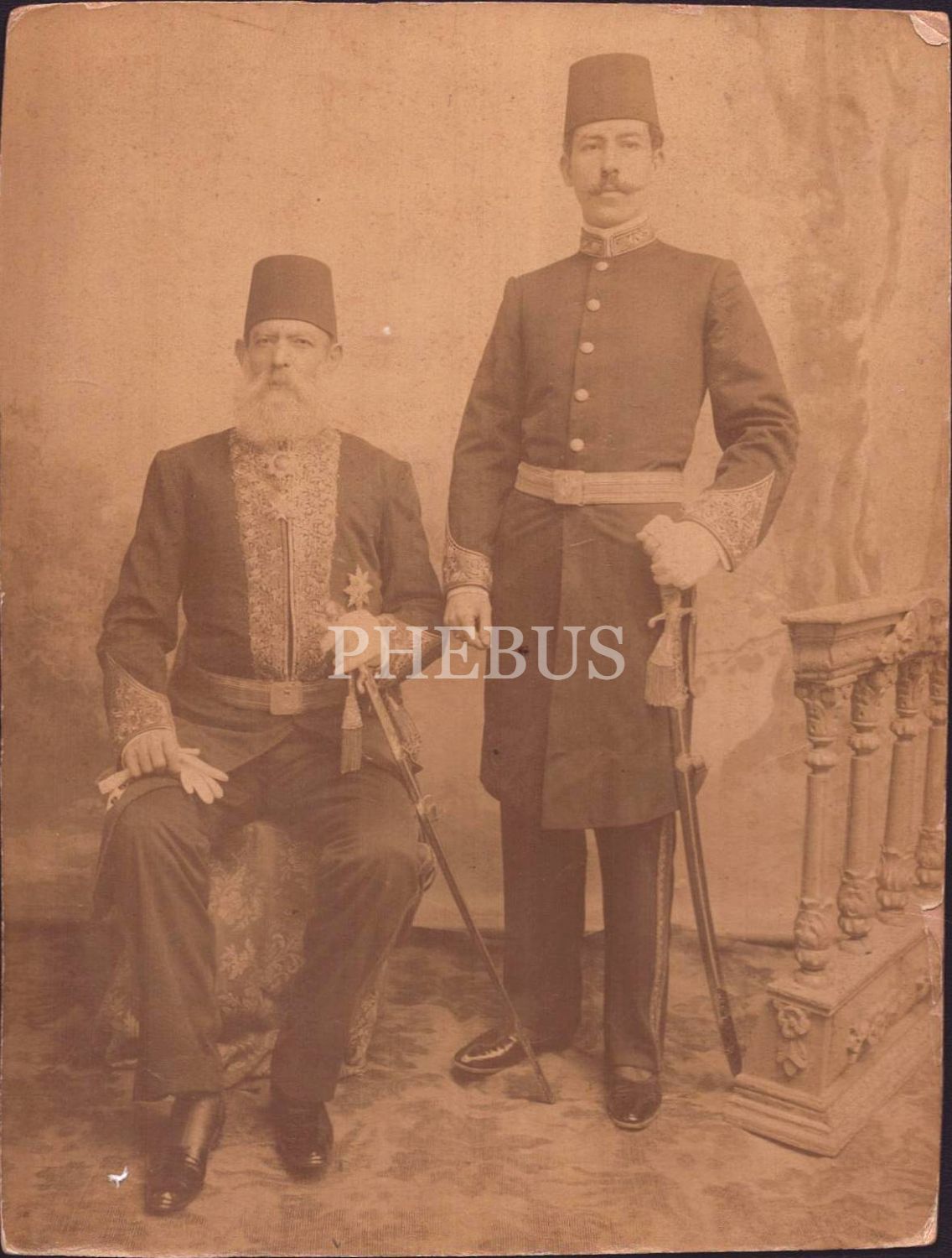 Sakızlı Emin Paşa ile oğlu Asım Bey´in üniformalarıyla aldırdıkları stüdyo hatıra fotoğrafı, 15x20 cm