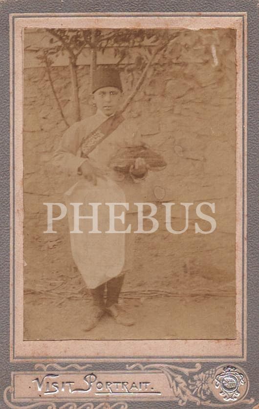 Osmanlıca yazılı kuşak takmış genç talebenin kartvizit boy (CDV) hatıra fotoğrafı, 7x11 cm
