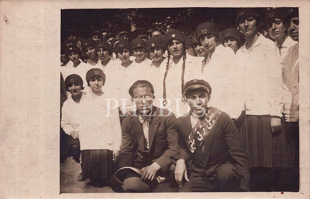Kuşağında "Şişli Terakki Mektebi" yazan genç ve okul arkadaşlarının hatıra fotoğrafı, 9x14 cm