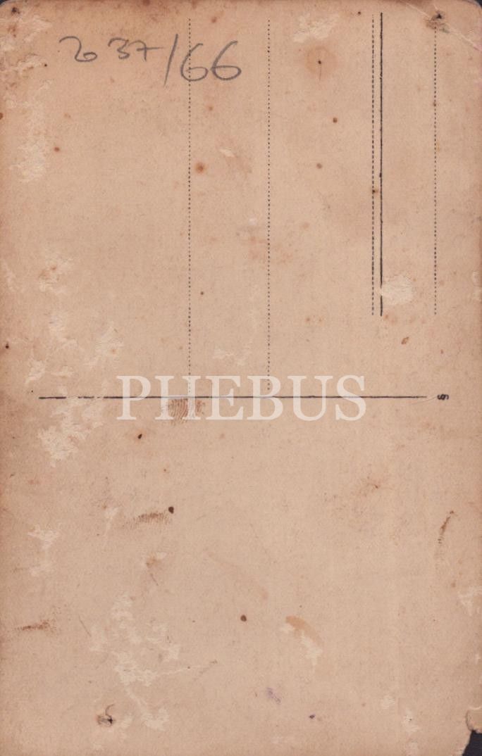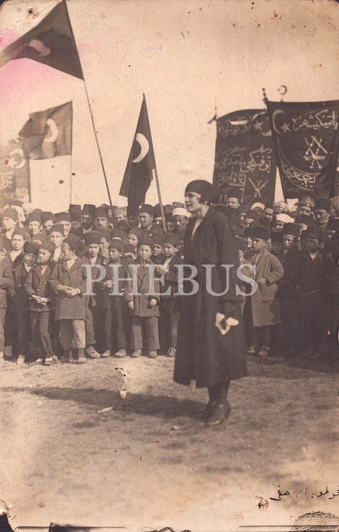 "Eskişehir" ve "Tüfenkçi" yazılı bir flama ile mektep talebelerinin görüldüğü millî bayram hatırası, 9x14 cm