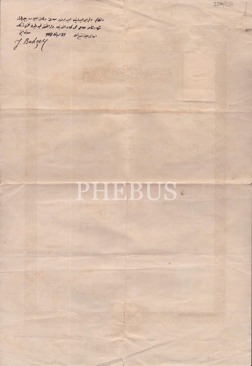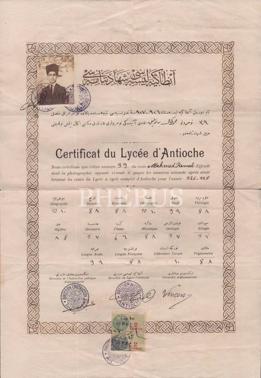 1926-27 senesi Antakya Lisesi tarafından Mehmed Kemal Efendi´ye Osmanlıca ve Fransızca haliyle verilen fotoğraflı şehâdetnâme, 28x41 cm...