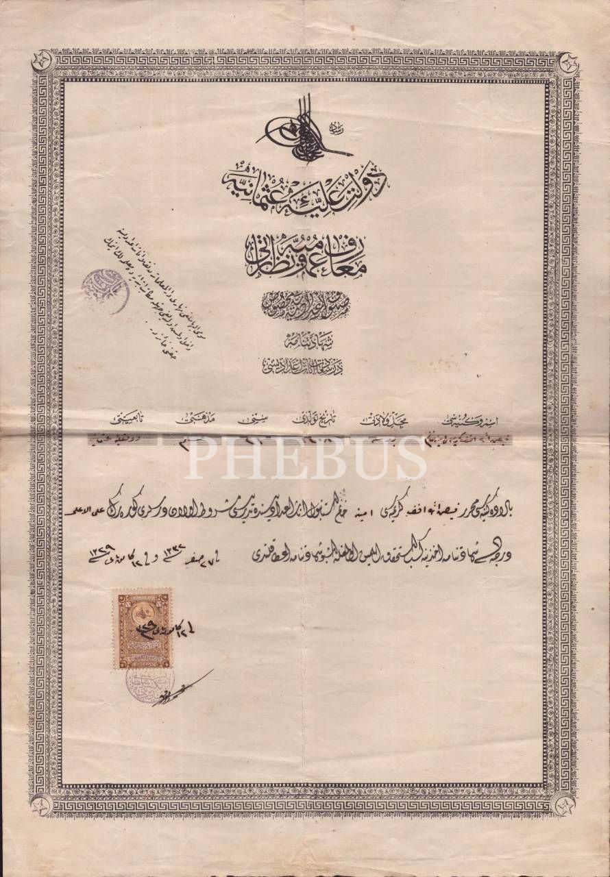 1329 senesinde Dersaâdet İnas İdadisi tarafından Emine Hanım´a aliyyü´l-aʿlā dereceyle verilen şehâdetnâme, 28x41 cm...