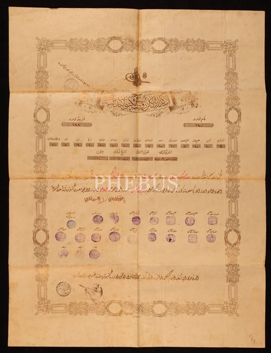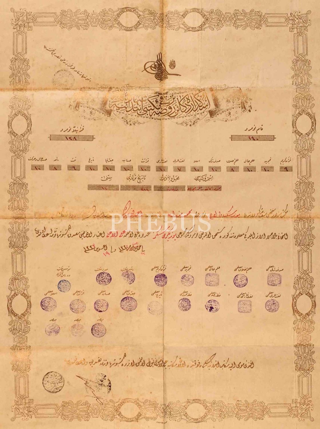 1322 senesinde Üsküdar Dekain-i Ravza-i Terakki Mekteb-i İptidaiyesi tarafından Ahmet Faik Bey´e aliyyü´l-aʿlā dereceyle verilen şehâdetnâme, 40x53 cm...