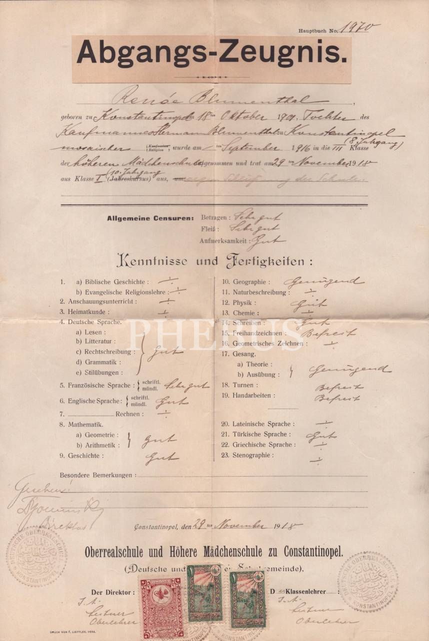 1918 senesinde Alman Mekteb-i Sultanisi tarafından Almanca haliyle verilen tasdiknâme, 25x38 cm...