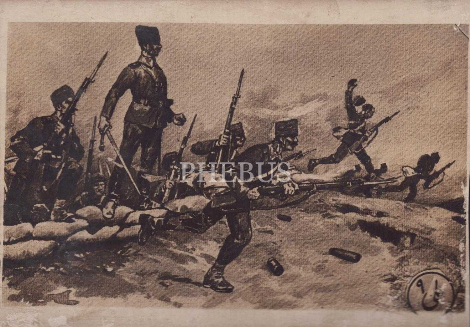 Düşmana hücum eden Türk askerlerini gösteren mefkûre kartı, 13x9 cm...