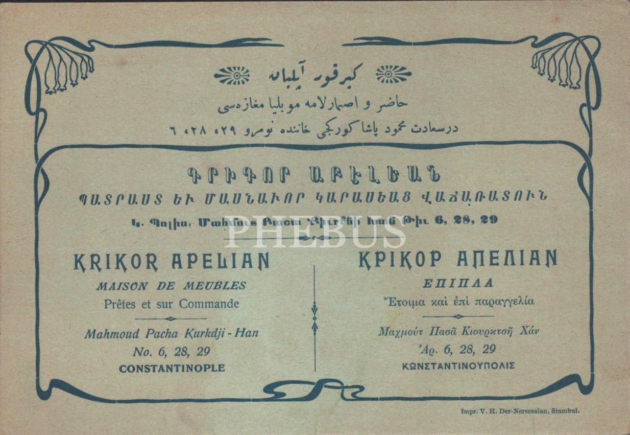 İstanbul adresli Krikor Apelian Mobilya Mağazası´na ait Osmanlıca, Fransızca ve Ermenice işyeri kartı, 16x11 cm...