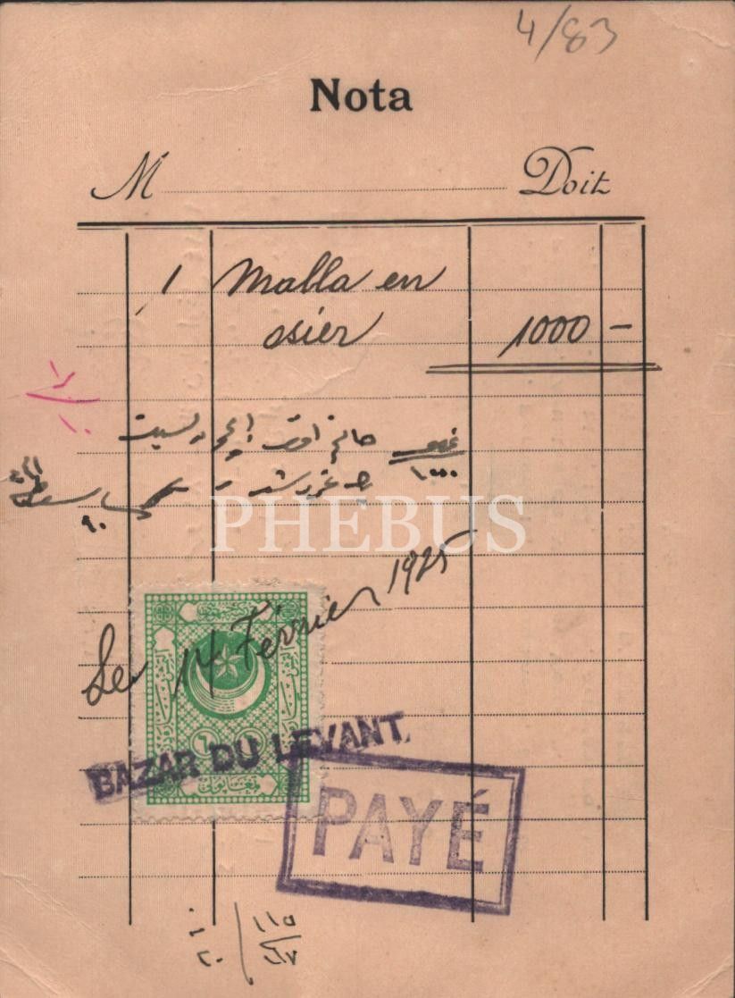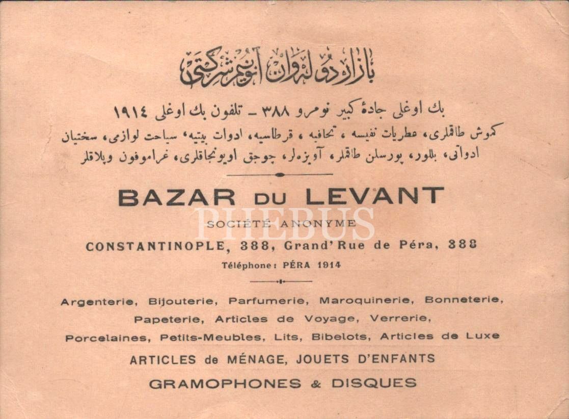 İstanbul adresli Bazar Du Levant Anonim Şirketi´ne ait Osmanlıca ve Fransızca işyeri kartı, 14x10 cm...