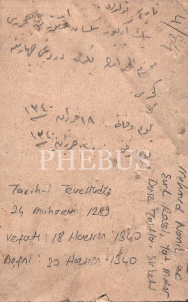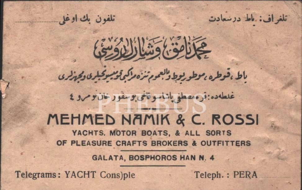 İstanbul adresli Mehmed Namık & C. Rossi Deniz Taşıtları Şirketi´ne ait Osmanlıca ve İngilizce işyeri kartı, 12x8 cm...