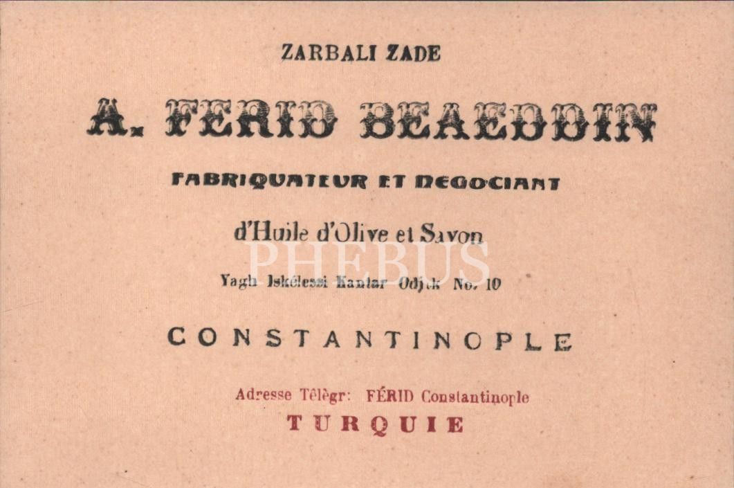 İstanbul adresli Fabrikatör ve Tüccar Zarbalı Zade A. Ferid Beaeddin´e ait Fransızca işyeri kartı, 13x9 cm...