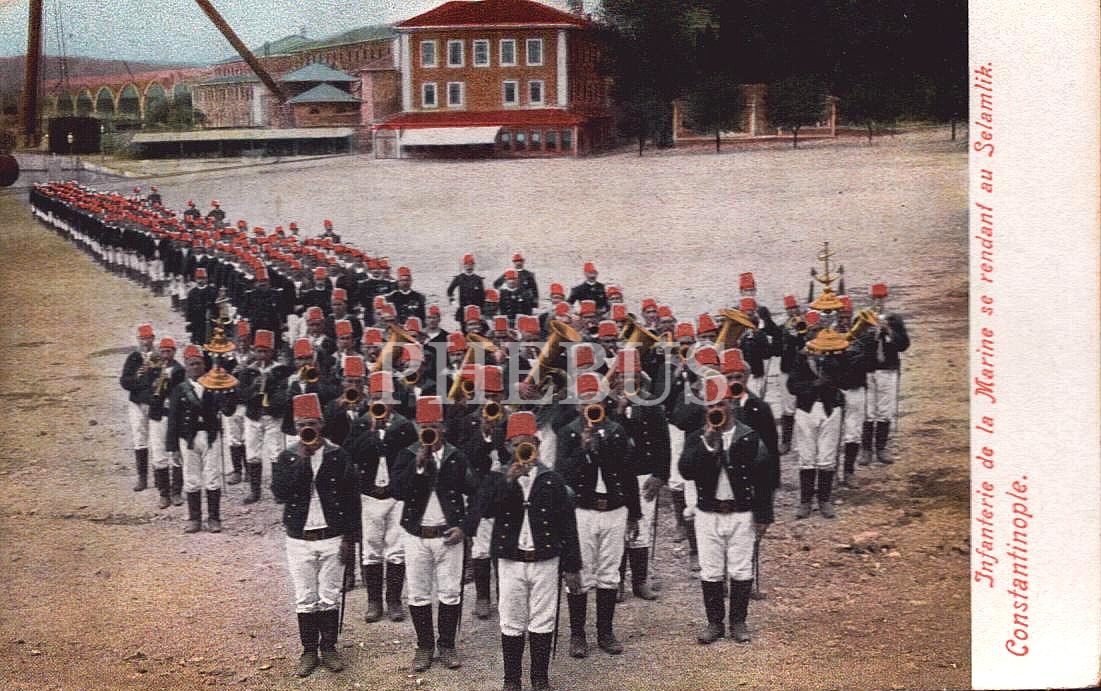 Bando eşliğinde Selamlık merasimine giden Osmanlı bahriyelileri, Constantinople, 9x14 cm