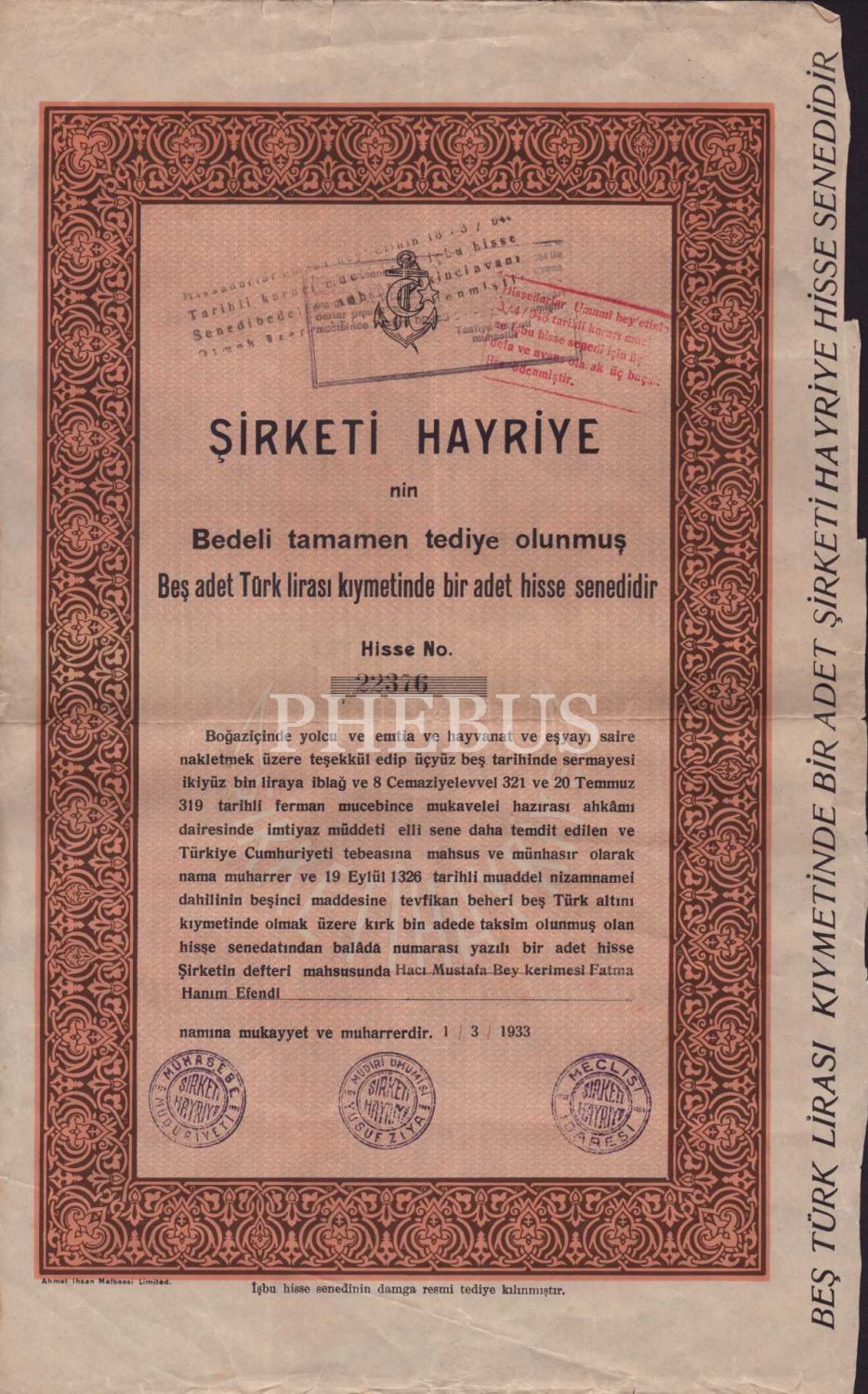 Şirketi Hayriye beş adet Türk Lirası kıymetinde hisse senedi, 40x26 cm...