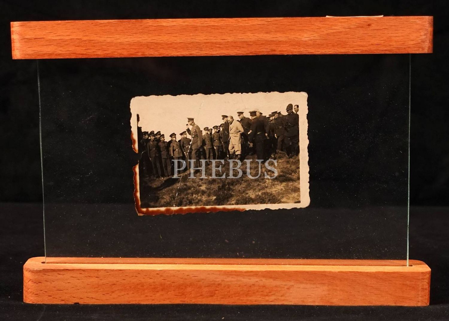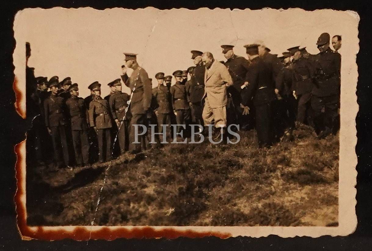 Mustafa Kemal Atatürk, Şah Rıza Pehlevi ve Fahrettin Altay Çanakkale Conkbayırı'ndaki askeri manevralar sırasında Harbiyelilerle birlikte, 23 Haziran 1934, 8x5 cm, çerçevesiyle birlikte 20x14 cm
