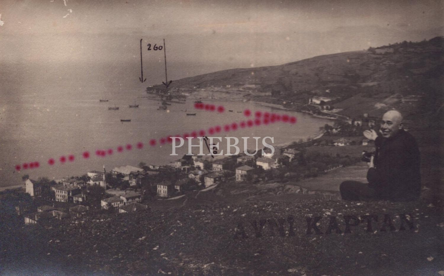 Şükrü Okan Paşa'ya takdim edilen, Avni Kaptan tarafından çizilmiş harita üzerine Zonguldak Ereğli´de Bababurun´a inşaa edilmesi planlanan limanın şeması ve Aynı bölgede Avni Kaptan´nın fotoğrafı...